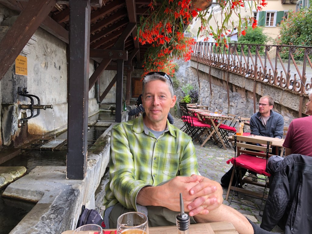 Our second stop is Montreaux- we’re spending two nights here, yes, it’s a rest day already. And it’s our 24th wedding anniversary. This a perfect lovely romantic place to spend two nights. We’ve walked the promenade, we took a train up into the hills behind town and walked down to find the most atmospheric restaurant ever for lunch.