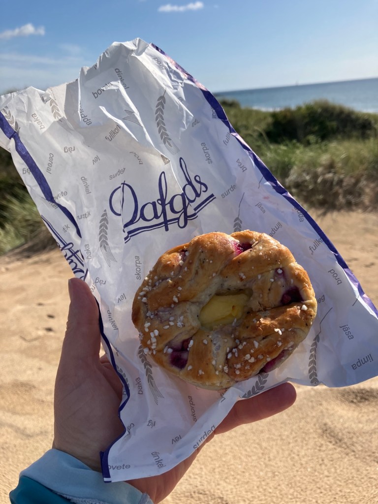 Do we always find a picturesque bench for pastry? Usually. We do sometimes ride on for miles and miles searching for a good spot to stop.Raspberry filled Danish. Cinnamon bun in Denmark. Rest day in Malmo, Sweden and a kanelbulle in the park. Cinnamon bun in Swedish.Another Swedish pastry break.At another fantastic location on the coast on Sweden’s National route #1.