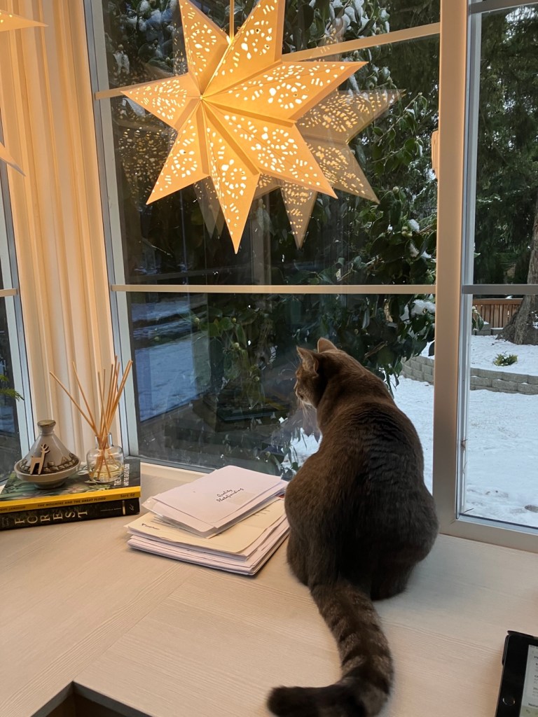 Once the snow and ice had melted we took one of the cats outside on her leash and harness. Seattle weather wasn’t done with us yet though. During our last morning at the house sit high winds caused a power outage. Now I regretted not having the small solar lantern I always take camping. Rich regretted not grabbing the headlamp he had held up in the storage unit. Thankfully, we had noticed where our host kept candles and matches, so, congratulating ourselves on our adaptability we began to pack up by candlelight.