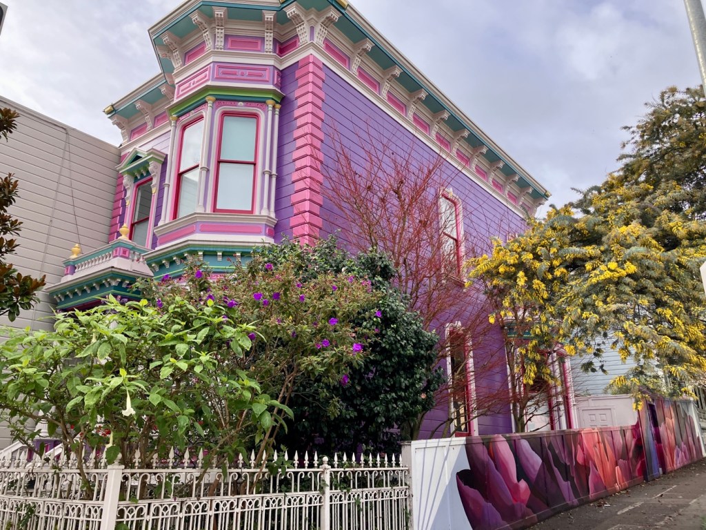 Let’s start with the architecture. And the way folks paint their buildings. The four or five color paint jobs on the Victorians always take my breath away, this one in particular. So bold. And the fence! This is a tour de force of color and joy. I love this house.