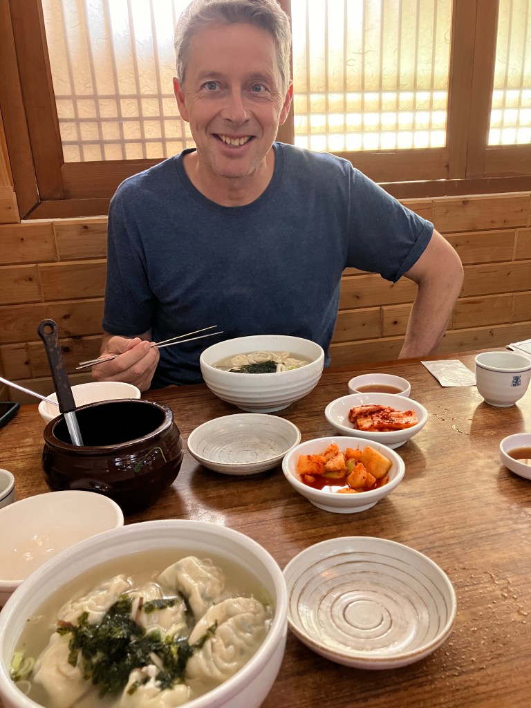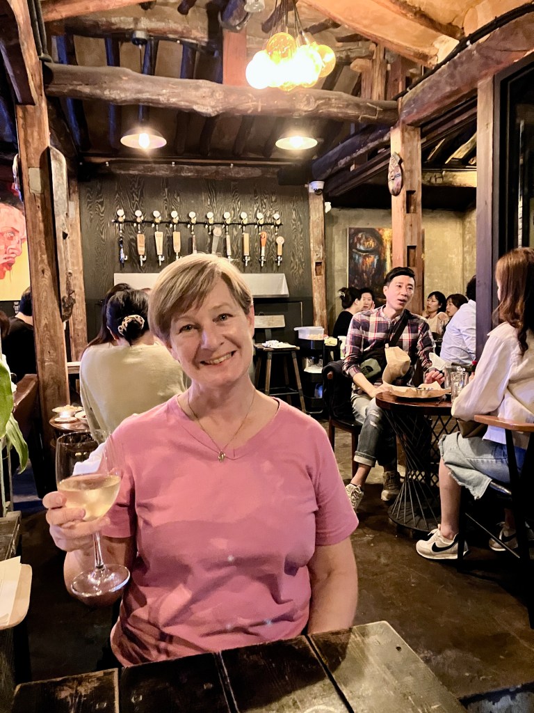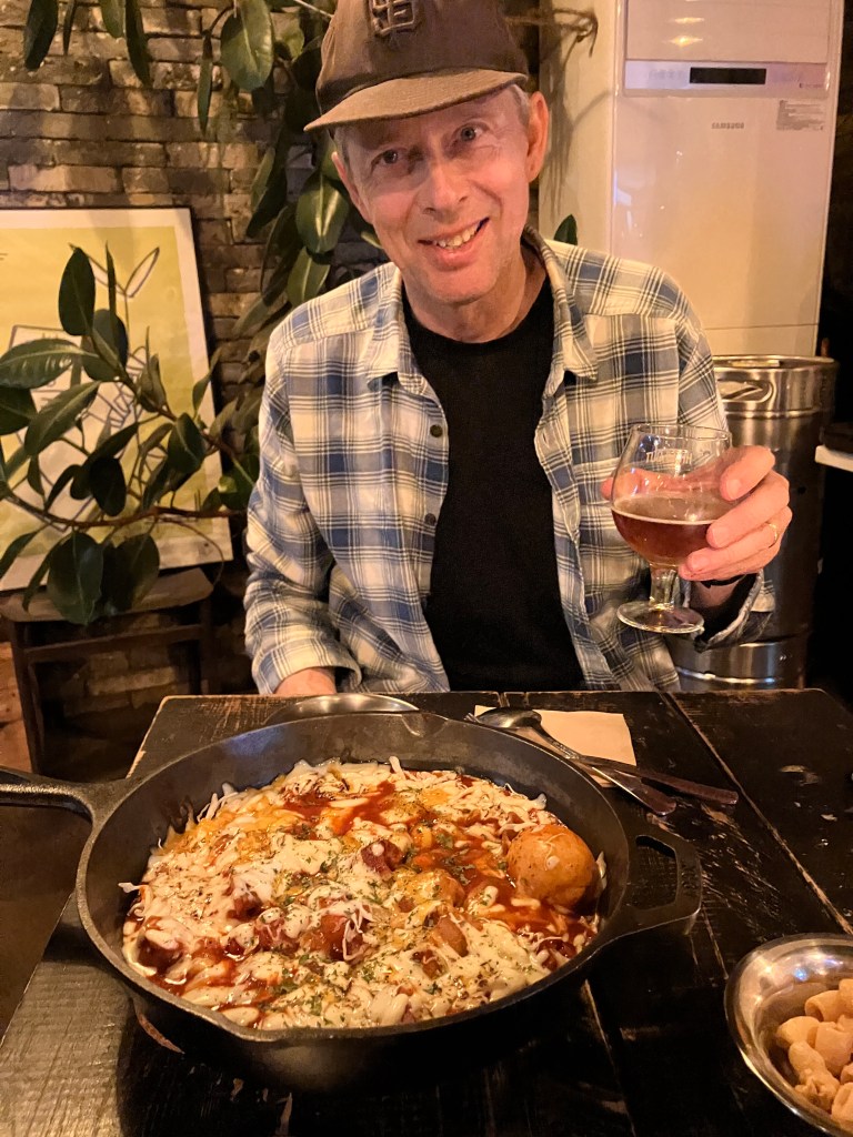 Our very first lunch in Korea. A dumpling place in the Insadong neighborhood of Seoul. Rich had eaten here on a business trip layover exactly ten years before.Cheryl very happy to be enjoying her first glass of white wine in the Ikseon-dong neighborhood of Seoul. Rich enjoying a craft beer and a skillet of Oven Cheese Tteokbokki (오븐치즈떡볶이).