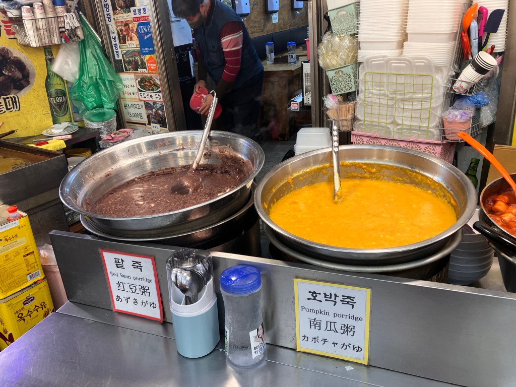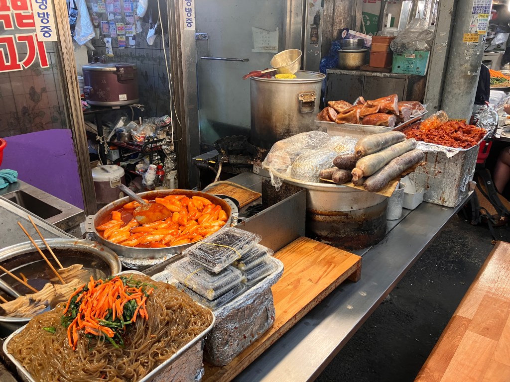 Had we not been full of mung bean pancakes I would have loved to try this pumpkin soup.We quickly got a bit overwhelmed in the market.Fish cakes, Korean glass noodles – Japchae is the dish of stir fried noodles – Tteokbokki, the spicy rice cakes, and the long sausages are Sundae: made with pork intestines stuffed with glass noodles, coagulated pig blood and vegetables, all steamed together.