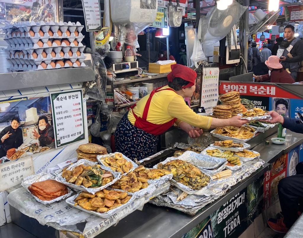 A stroll through the Gwangjang market to try Mung Bean Bindaetteok (녹두빈대떡).This snack turned out to be a big serving. The small dish is pickled celery, we think. And kimchi came out after Rich, a kimchi fan, asked for it.