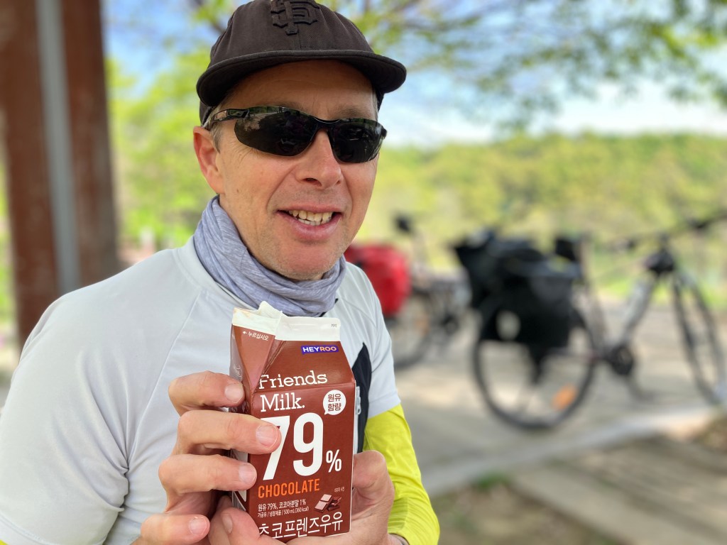 Bibimbap, or mixed rice dish. Sometimes in a hot stone bowl (dolsot), or mine in a tin bowl, vegetables and an egg. We quickly learned that not everyone finishes the little dishes of pickled vegetables and fish.This little street is known as a Pocha, short for Pojang-macha, a restaurant or street that serves Korean comfort food. It’s where we had the bibimbap in the previous photo.Our first night on our bike tour we had sushi and noodles. And yes, that stain on my placemat is the splash from when I dropped a piece of sushi in the soy sauce. Chocolate milk. A great energy drink while cycling.My favorite bike touring lunch, a picnic. This was taken right before we realized we were sharing our bench with spiders. This is not a typical dinner scene on our bike ride, Rich got the beef bulgogi set meal, I got pasta carbonara. Our hotel offered Korean and Western food. Usually it’s all Korean food.