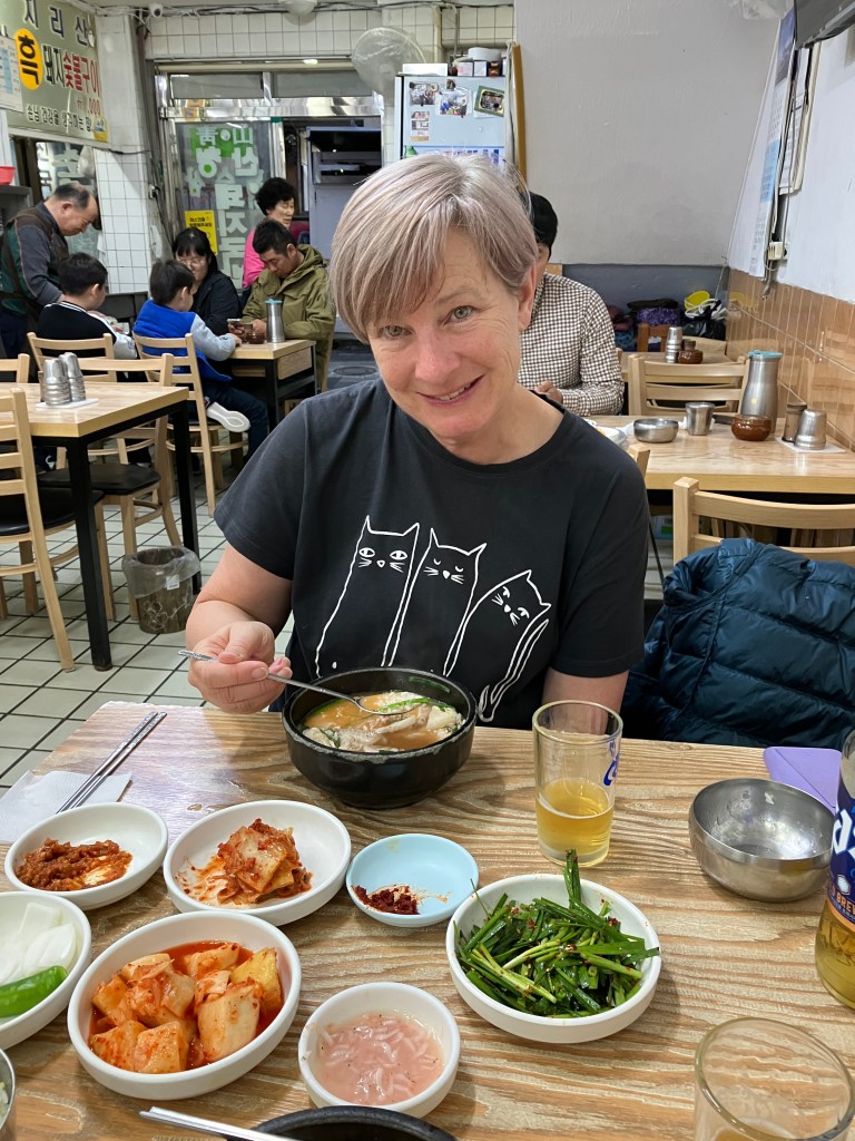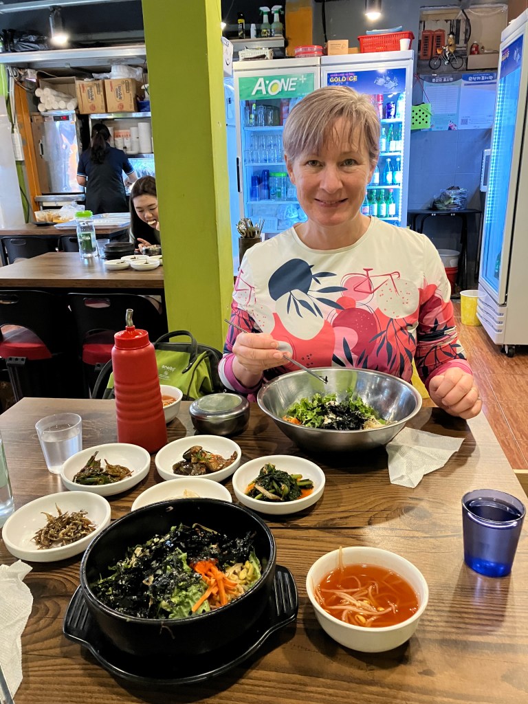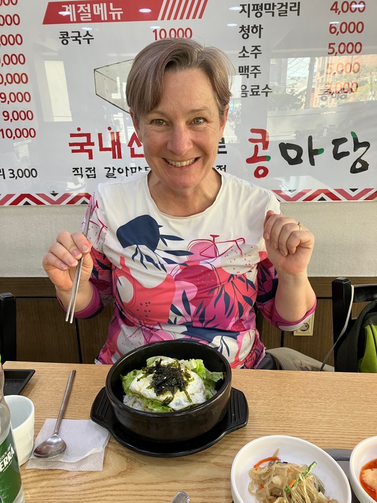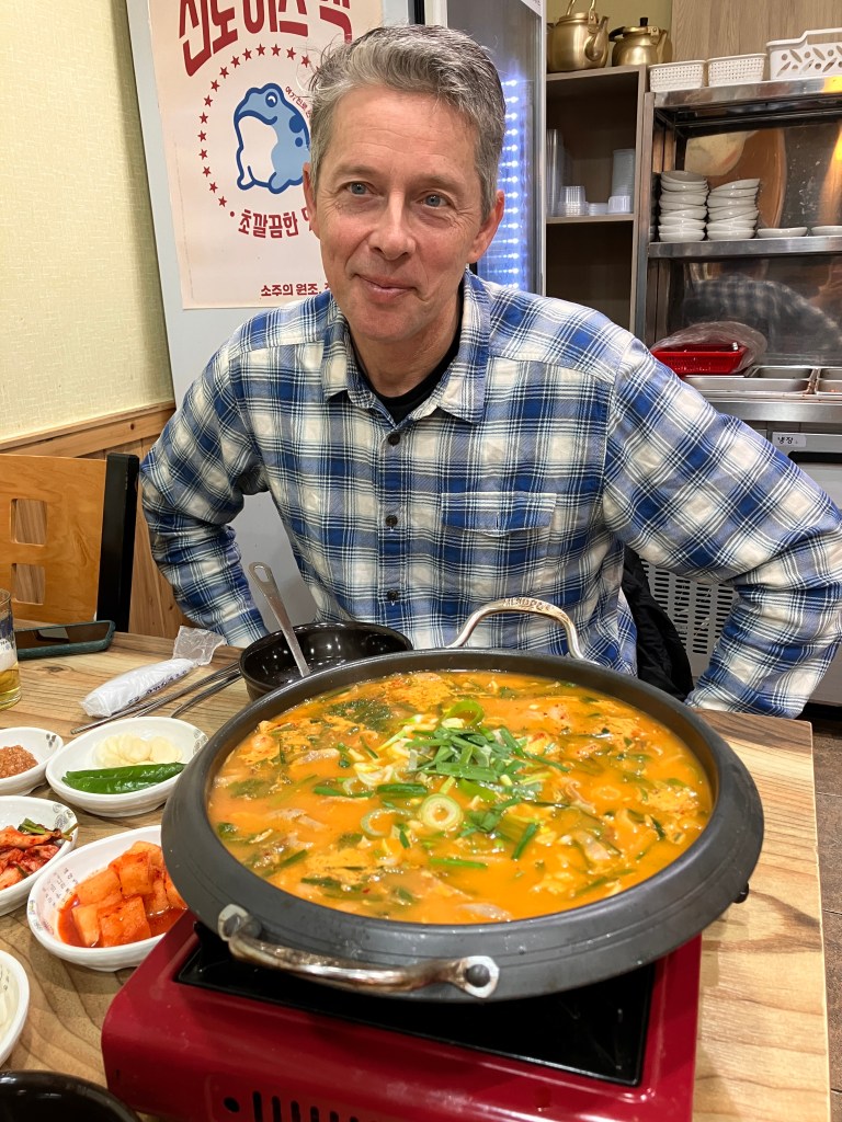 Hiked off a mountain and into a tofu restaurant. The table of gentlemen behind Rich were having fun and that enticed us in. Who’s excited by her tofu bibimbap with an egg on top?The meal sets are another fun easy way to order. I got beef bulgogi (again), and Rich had ginger chicken soup.The soup arrived bubbling away in its dolsot.