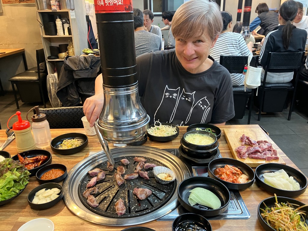 Was it the cute pig on the sign that drew us in?It was the perfect mix of some tables full, but not too crowded. That way we can watch how other diners proceed but not feel too overwhelmed. That’s a little dish of garlic in oil on our charcoal grill.I was doing my best to be grill master of the meat we got. (We’re still not sure what it was, our translation app was a bit vague on this one.) The other dishes contain an egg soufflé/omelet, pickled daikon, Kimchi, leaves to wrap your bbq in, and loads of other veggies and seaweed. The friendly waitress came over to give me a hand. I was being too careful, she dove in and tossed that meat around!Belly full, happy to have a 15 minute walk to the subway station through little back streets. We did willfully break some food norms. Koreans don’t walk and eat like we Americans do. Everyone else who got ice cream sat at the shop and ate it. We strolled.One final river path walk in the morning before heading by train to the airport.