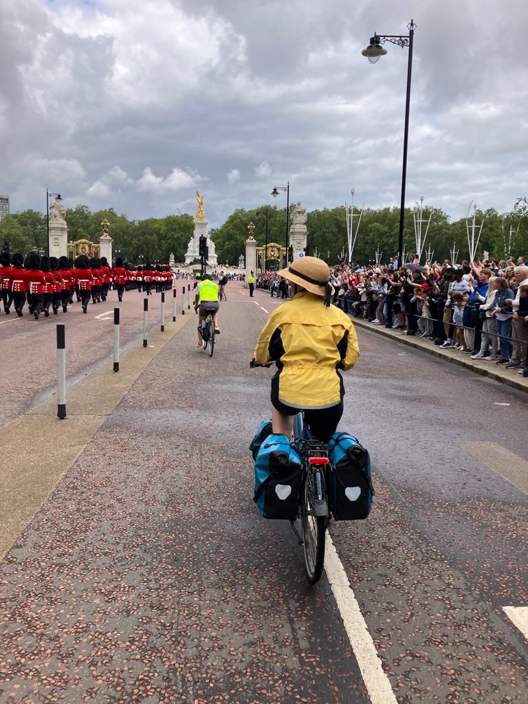 Our route took us past Buckingham Palace, which always gives me a thrill to see, and on to Hyde Park. From Hyde park we rode towards Hammersmith and joined the Thames River. First stop: pub lunch at the Blue Anchor. When we have our loaded touring bikes we make sure to sit outside somewhere we can keep on eye on the bikes. Our new bikes have spoke locks which are super easy to simply click into place, and we joke that it would take an unusual thief to be able to jump on Rich’s huge loaded bike and ride away without immediately crashing, but we are happier when we have the bikes in sight.