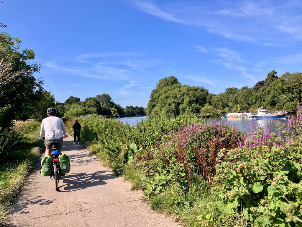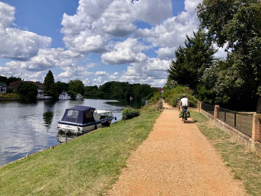 After our night in Syon Park, which would be worth exploring on a future visit, we decided to ride the Thames Path all the way to our destination just outside Windsor. Again, not a direct route, but certainly a scenic ride. It’s fun to have no idea what to expect from a route. The surprises around bends in the river, the views across the river, the varying surfaces of the Thames Path – everything was new to us.