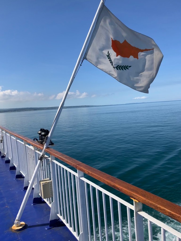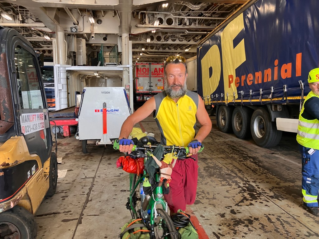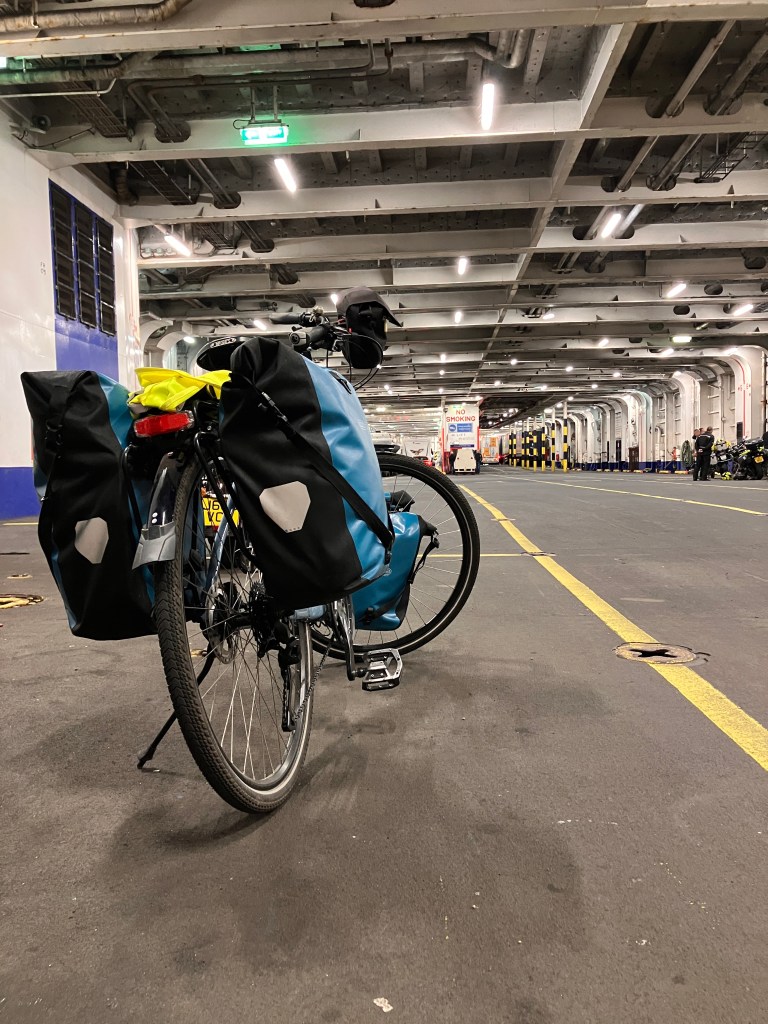 I love traveling by ferry. It’s a fantastic way to get between the continent and the UK or Ireland without flying. Flying not only has a bigger carbon footprint than the ferry, but it’s also a pain with bicycles. Ferries and bikes are quite easy. At Fishguard the bikes wait with foot passengers, who are driven onto the ferry by a bus, but we bikes get to wheel on with our own escort.