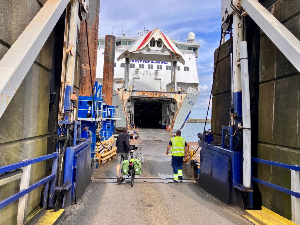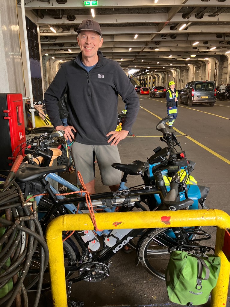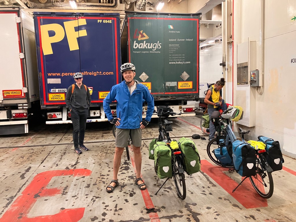 We were a bit mystified and annoyed by the fact that this ferry seemed to allow only four bikes on. When Rich was making reservations the website told him at first that there was only 1 bike space left. He was able to get both bikes on the next day, it seems that when his initial attempt to reserve and pay hung up in the payment phase, it locked down the 2 bike spots and they needed some time to reset and release. David agreed with us that it was ridiculous to allow only four bikes on a massive ferry loaded with cars and trucks, he said he would probably just show up and talk his way on, if he had been denied a bike reservation. We’re not that confident in our gift of gab, not being Irish, but we all agreed to send sternly worded emails to the Stena Line Ferry company. (We otherwise really like this ferry company.)