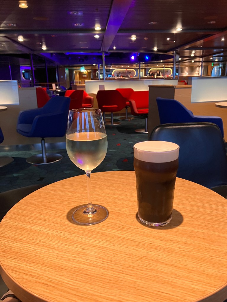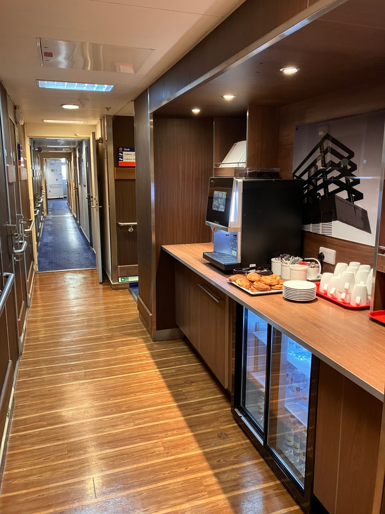 The cabin had a kettle, tea and coffee, some snacks, outlets with continental plugs – two pin – and a very decent sized bathroom. More later on morning amenities. First, off to the bar!
