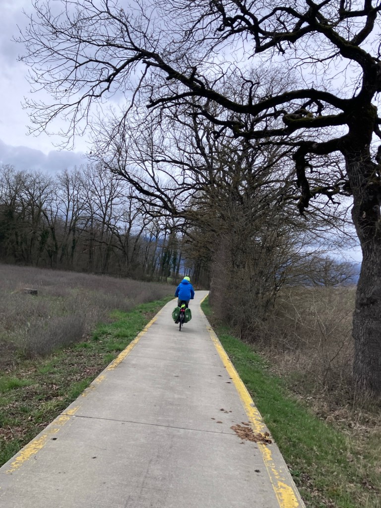 Riding into Lyon. Looking forward to seeing friends, and happy the weather is warming up.
