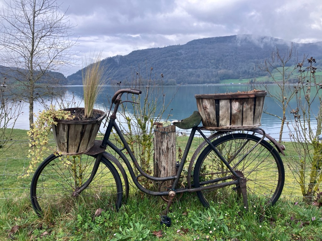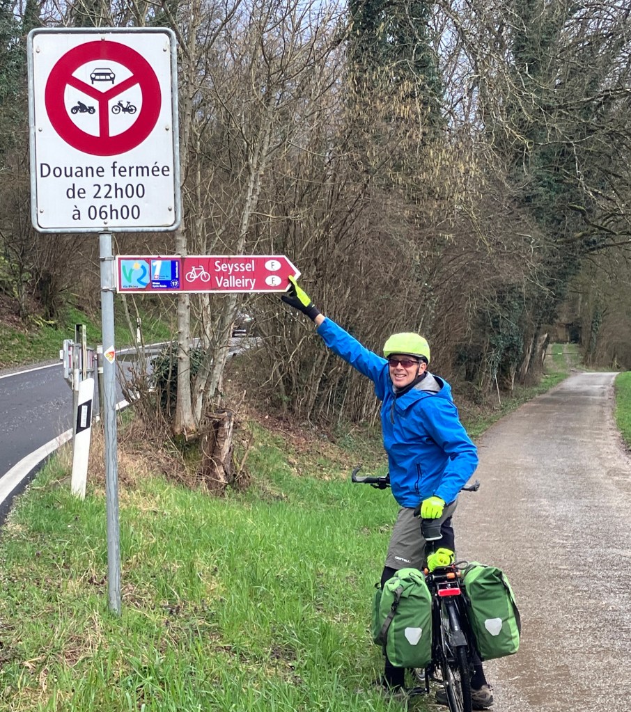 After a morning ride through Switzerland, back to France. Borders still resonate with us, especially when crossed by bike.