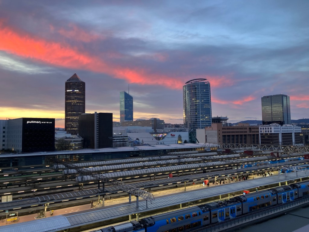 Sunset over the Gare de part Dieu. From our Ibis hotel room if we opened the double paned windows we could hear the platform announcements.