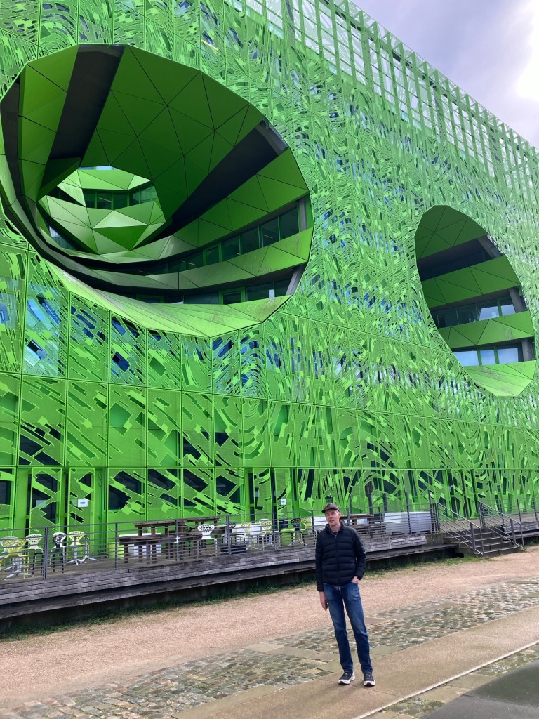 Rich creating an accidental face at the EuroNews building near the Confluence in the 2nd Arrondissement in Lyon.