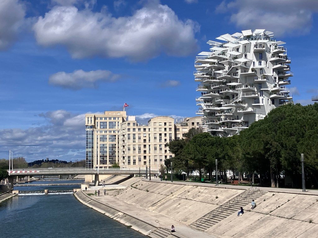 L’Arbre Blanc (White Tree) housing tower on the Lez River in Montpellier.