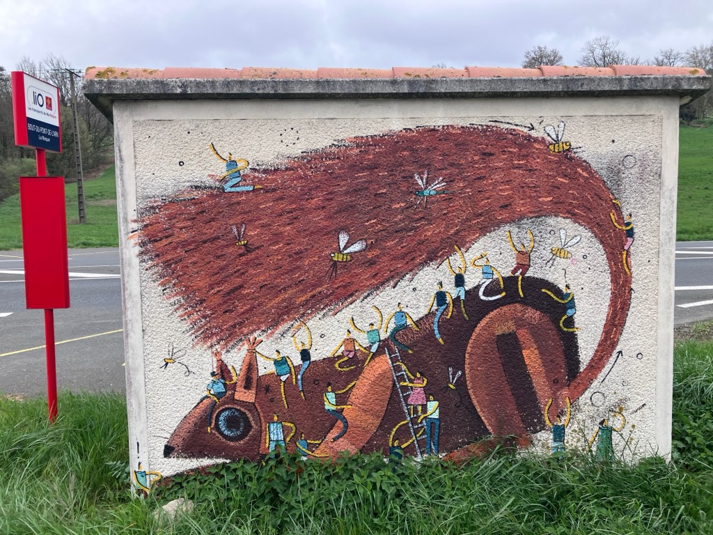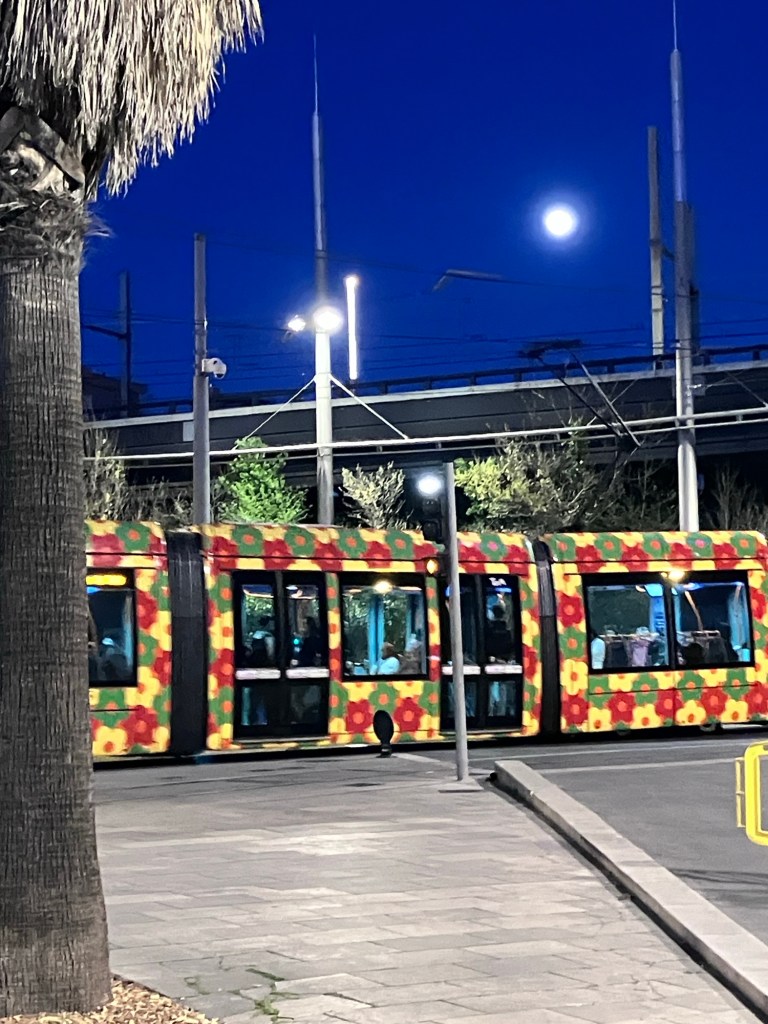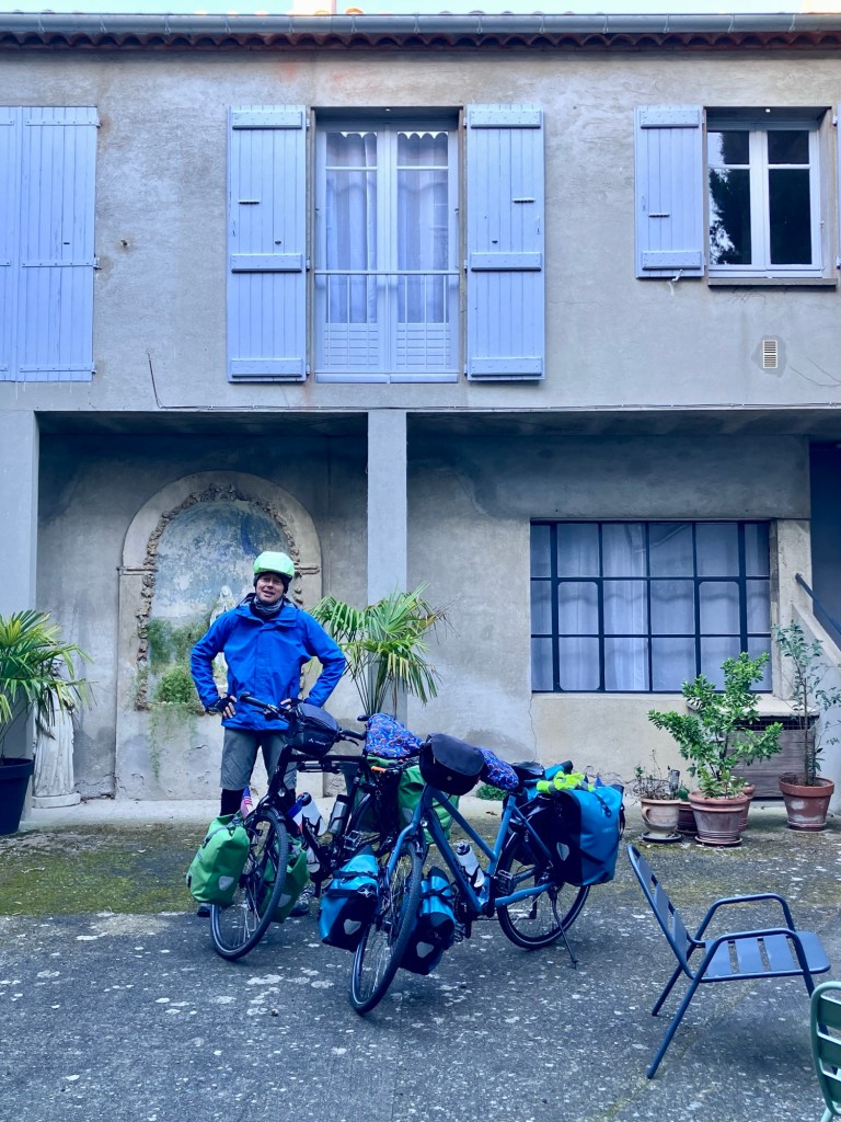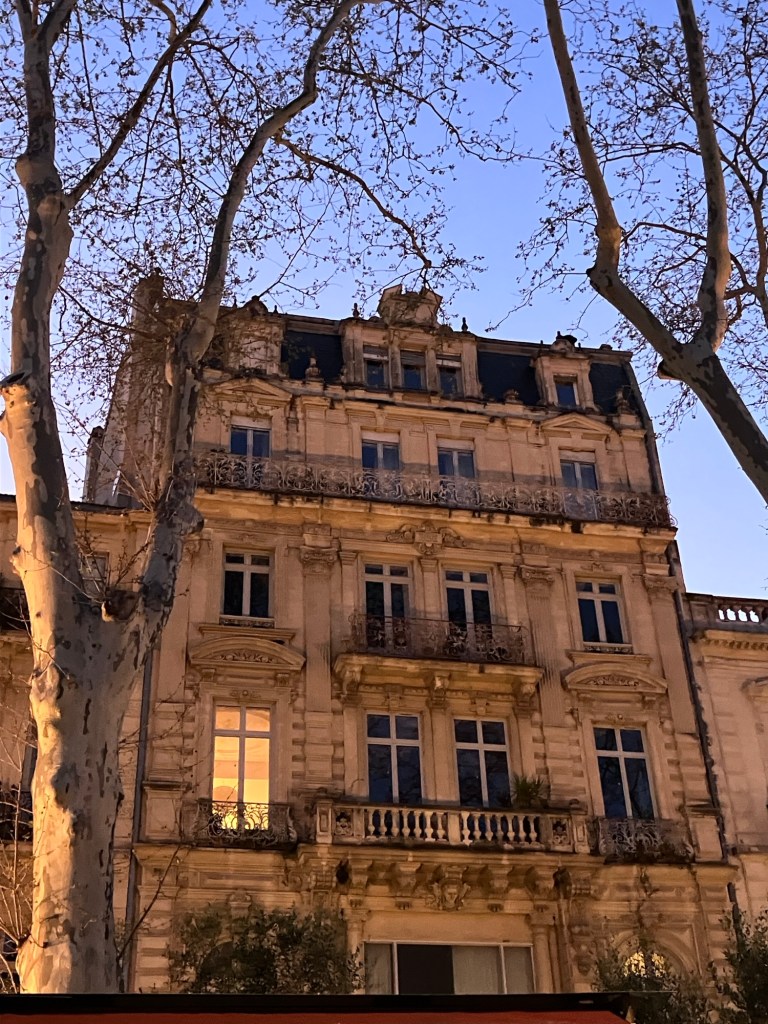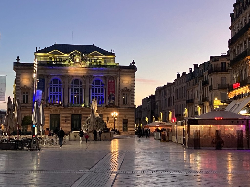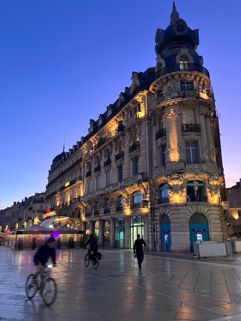 Why, I wondered, looking at my photos, were so many of Montpellier at night? Oh yes, we had holed up in our hotel room for almost an entire rainy day. We had breakfast at the hotel and ate the lunch food we’d bought and not eaten the day before. A kettle and mini-fridge kept us happy. We finally emerged in the evening to find dinner and admire the city. For years we’d been referring to Montpellier as “the city of tomorrow, today”, from a trip in 2018 when we marveled at the new tram system. Now we got to marvel at how bicycle and pedestrian friendly the city is as well.