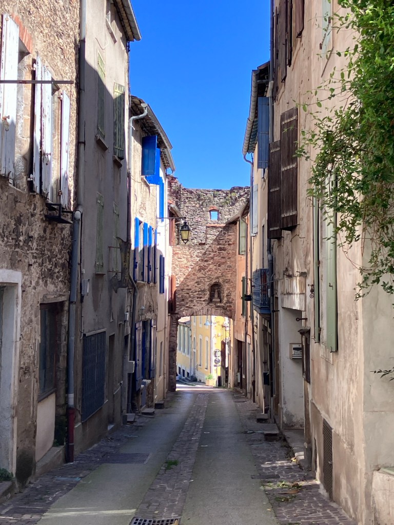 Old town narrow streets in Olargues. Must be a bench here somewhere.