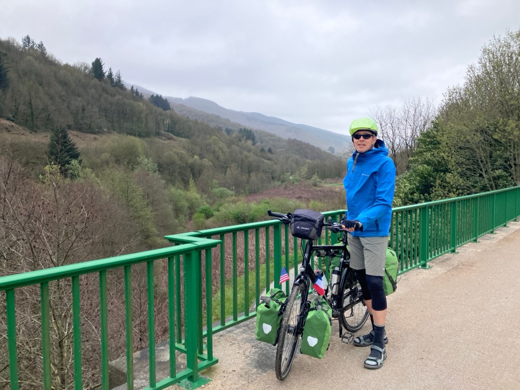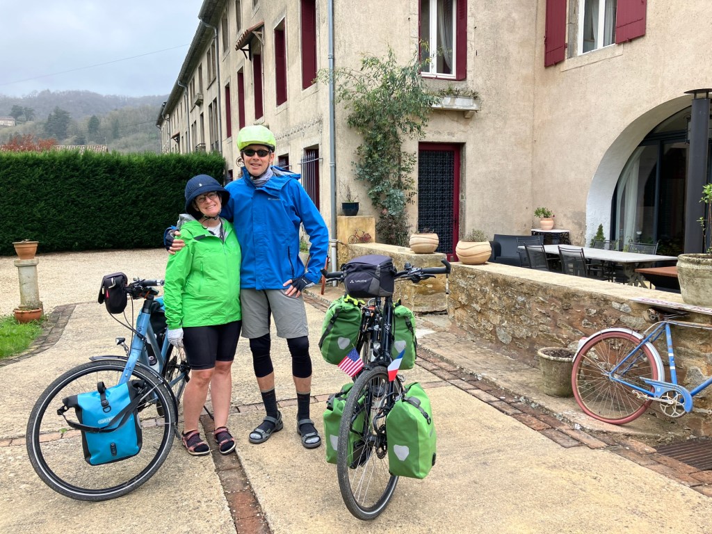 The day from Cessenon-sur-Orb to Labastide-Rouairoux was beautiful and varied. We had lovely smooth roads, newly constructed rail trail, quiet small roads, and stunning views and villages. It was a tougher day than we anticipated since it was a long climb, gentle most of the way but still up for 20-30k. It’s more tiring to ride long flattish days since you are in the same position on the bike, using the same muscles, hour after hour. We were thrilled to crest the pass of the route and through a long tunnel – avoiding the very highest ridge – and coast into Labastide-Rouairoux, which is a former textile town. The rail route we were riding had brought wool to the town and taken fabric away.