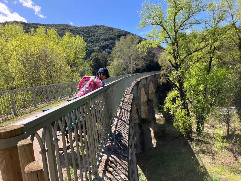Cheryl on the Pont Ferroviaire de l’Orb which carries the Canal du Midi over the Orb River.