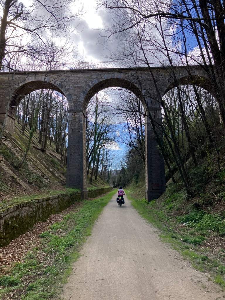This section of the Passa Païs is on an old railroad right of way. There is ongoing work to the route so not every bridge is bike ready yet, but enough are that you avoid most descents to and climbs out of river or creek valleys.