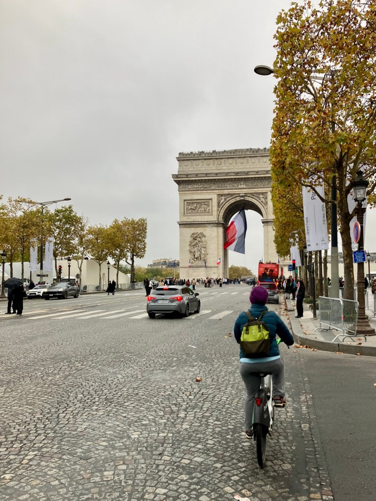 After all that cycling around France we did this year – finally! The Champs-Élysées to the Arc de Triomphe.Now we can fully appreciate the cobblestones the Tour de France cyclists face in the Paris circuits that typically feature in the last stage of the race.Not our own comfortable bikes, but a great way to explore Paris.The Tunnel des Tuileries. Once full of auto traffic, now graffiti, bikes, and pedestrians. Delightful.And along the Seine River on a road where cars used to be.Notre Dame, just a few weeks from re-opening after the devastating fire. That’s Rich on the bike on the right.After parking the bikes we snapped the apparently obligatory Eiffel Tower photos.Yup. We were here. Proof.