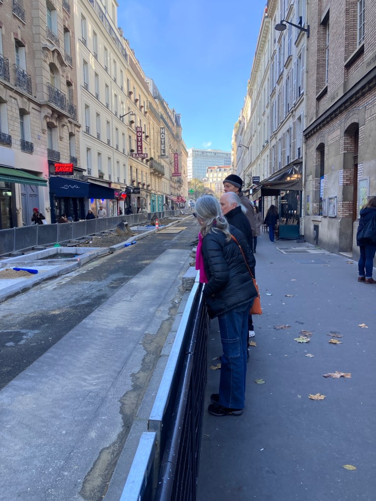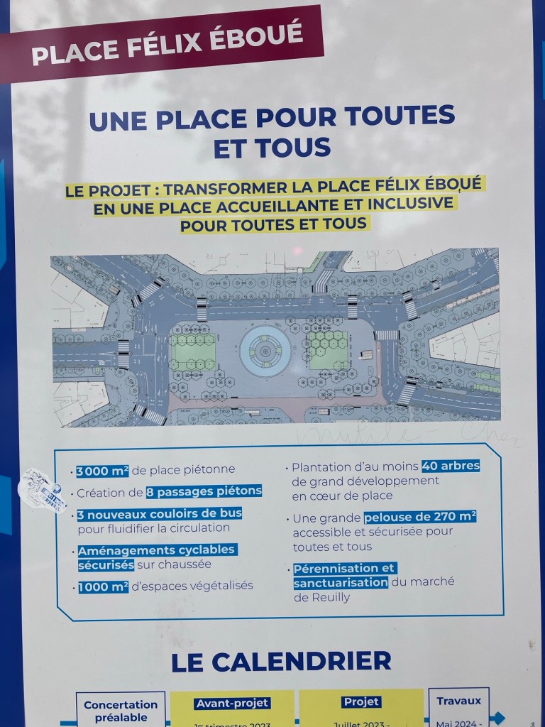 Paris is doing a lot of street re-imagining, making more space for people not using cars to get around. This is a street in the Montparnasse neighborhood getting an update. Wider sidewalks and planting areas.And in the 12th, a massive redesign of Place Félix Éboué, adding bike and pedestrian space, more trees and amenities, and removing car lanes.These changes seem to have brought out a lot of folks on bikes.On my Paris bingo card this lady transporting her dog and baguettes would be quite a get.Of course we got out on bikes! Despite the chilly weather.