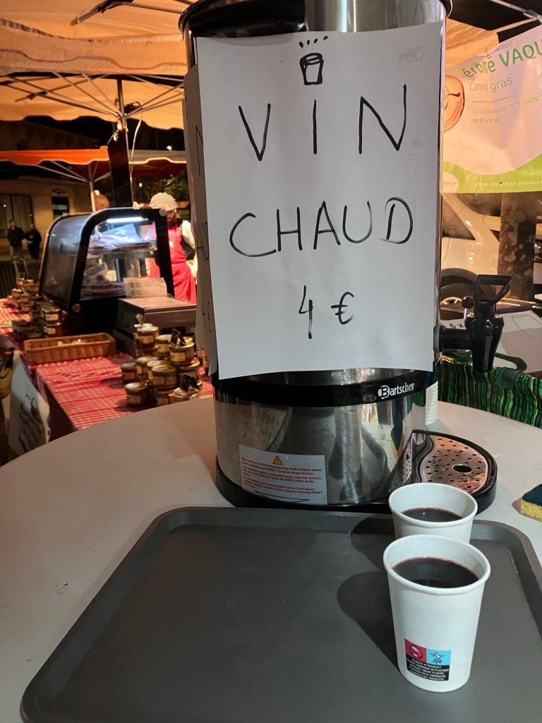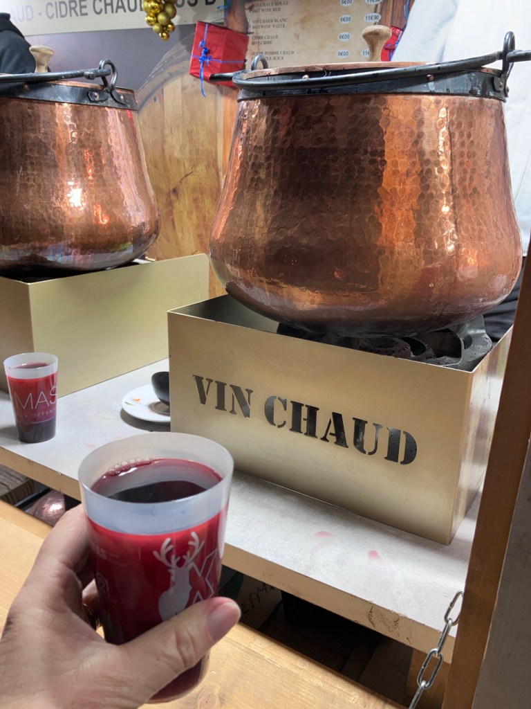 Chocolate Christmas tree. Buy a forest of them!Baby Jesus meringues. Apparently a retro treat, it’s a soft candy, not a hard crunchy one. I think it’s more like a marshmallow or melt away candy.A forest of Christmas trees for sale in the 17th arrondissement.The netting on the trees looks like spider webs.Trees for sale on R. des Martyrs which is closed to car traffic on Sundays.Nancy and I inside Galleries Lafayette admiring the massive Christmas tree.Which put on quite a show as it changed colors.We walked to museums.We walked to go to specialty shops only open on Saturdays to buy artistic stamps.We walked until the sun set (at 4 pm) to watch the lights come on.We even walked in the snow.All that walking meant we needed to keep up our strength. The soufflés at Le Récamier were just the thing.We had a one meal out per day rule. So we made those meals count. Sometimes we didn’t need to go far. This oyster stand set up one weekend for two evenings on our neighborhood market street.12 shucked oysters from Brittany and white wine.Thanks to Dan we visited Buns Land for some amazing Biangbiang noodles. Mostly take away with just three stools at a tiny counter.We also drank vin chaud when we could. Hot mulled wine. This was the best we tried, from the wine stand at the regional merchants evening market where we also had the oysters.Rosy cheeked vin chaud drinkers.Had to try it at La Défense Christmas market too! Complete with souvenir cup.Nice and hot, but a bit sweet. But we kept our souvenir cups to savor sweet memories.More vin chaud please! At a small Christmas market at Pl. des Abbesses.A nice version, not too sweet. The quality of the wine was not as good as at the regional merchants evening.