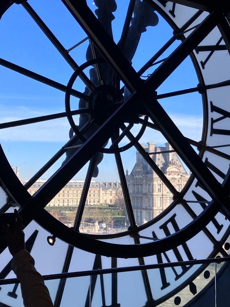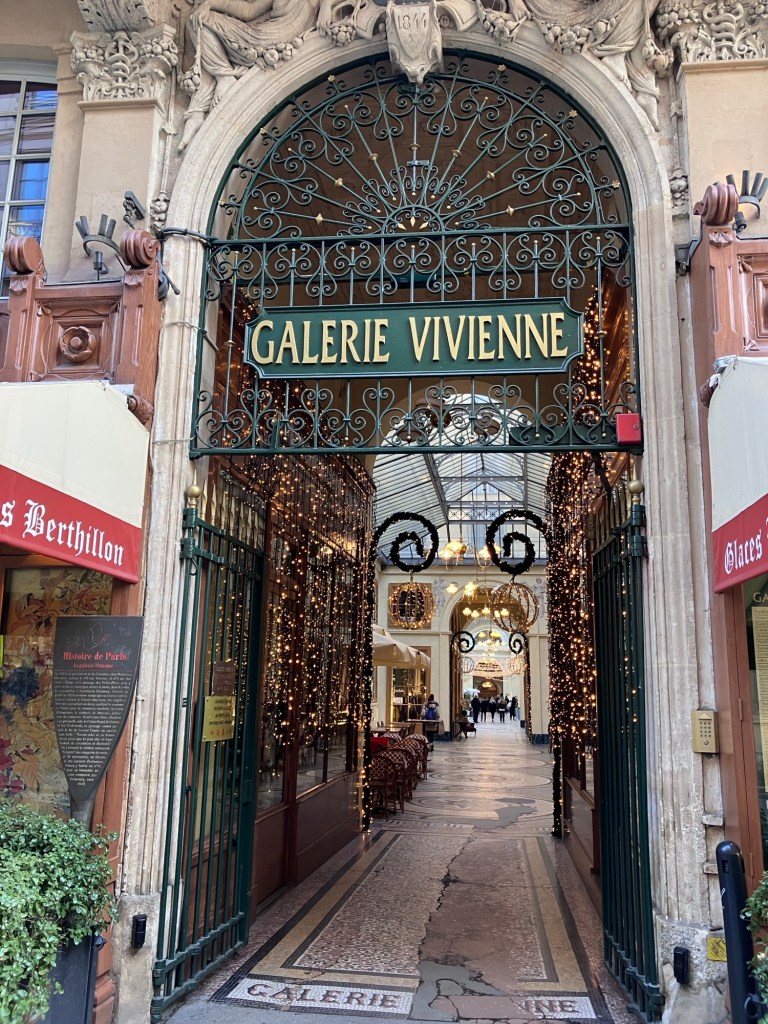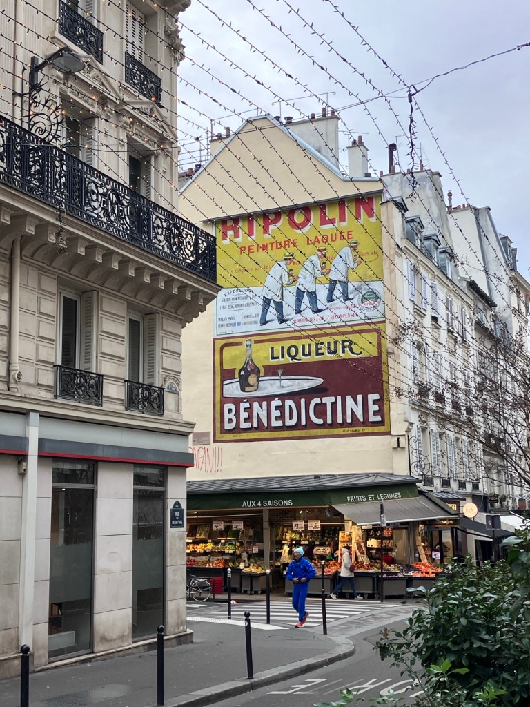 Enjoy coffee and chocolat chaud.Coffee shop dog. The family who ran the shop had their two kids and dog keeping them company since it was a holiday and schools were closed.Nancy joined us in Paris and shared our cafe stops and delightful times.I particularly love Kermit and the painted poles echoing his color scheme.Neighborhood markets and murals, Montparnasse. A wall of old advertising, uncovered and refreshed on Rue des Martyrs.In the 9th. The society of mineral water building.The bubbly water in the pipe!The beauty of Paris.The passages.The people in dark wool coats strolling the passages.Basilique du Sacré-Cœur de Montmartre glimpsed from Bd Haussmann on our way somewhere one morning. And the real life of a city going on.Sacré-Cœur from the Musée d’Orsay.Enjoying a chocolat viennois at the Cafe at d’Orsay.One of the famous and stunning clocks at the old train station turned museum.
