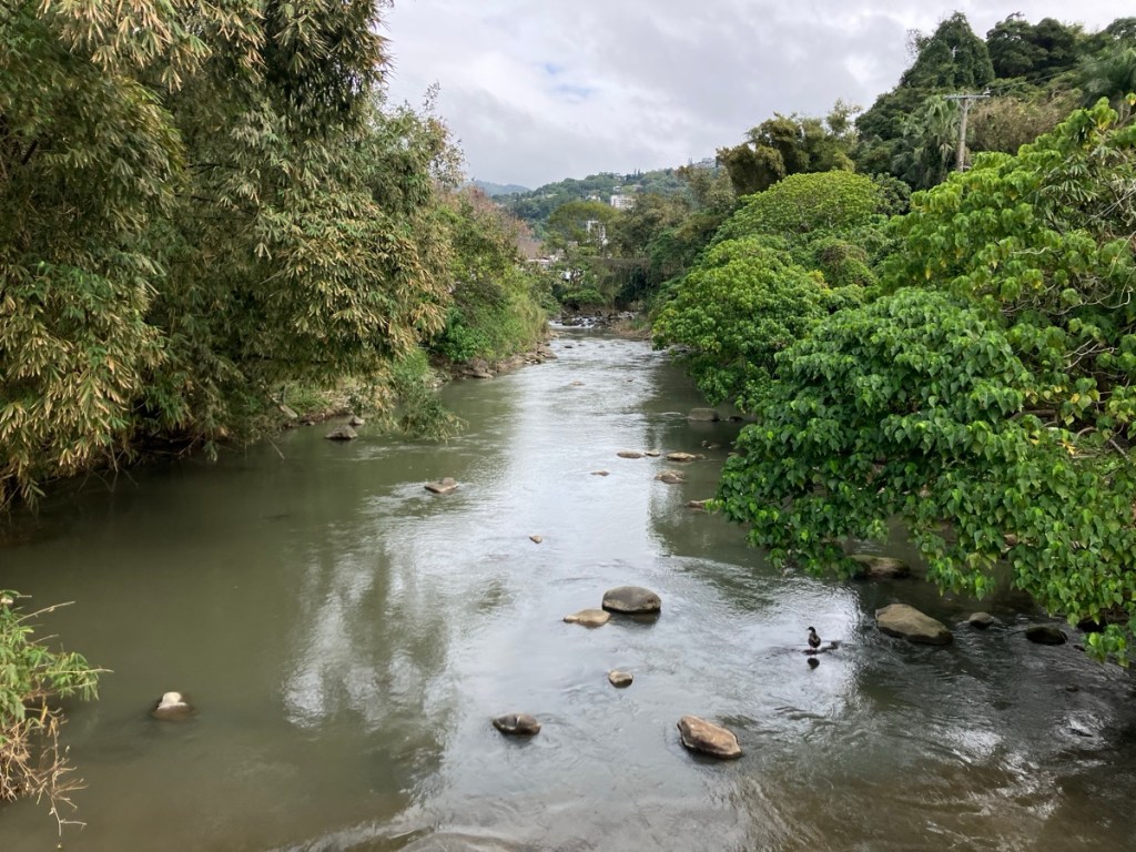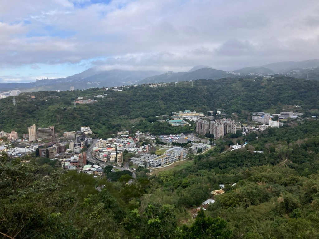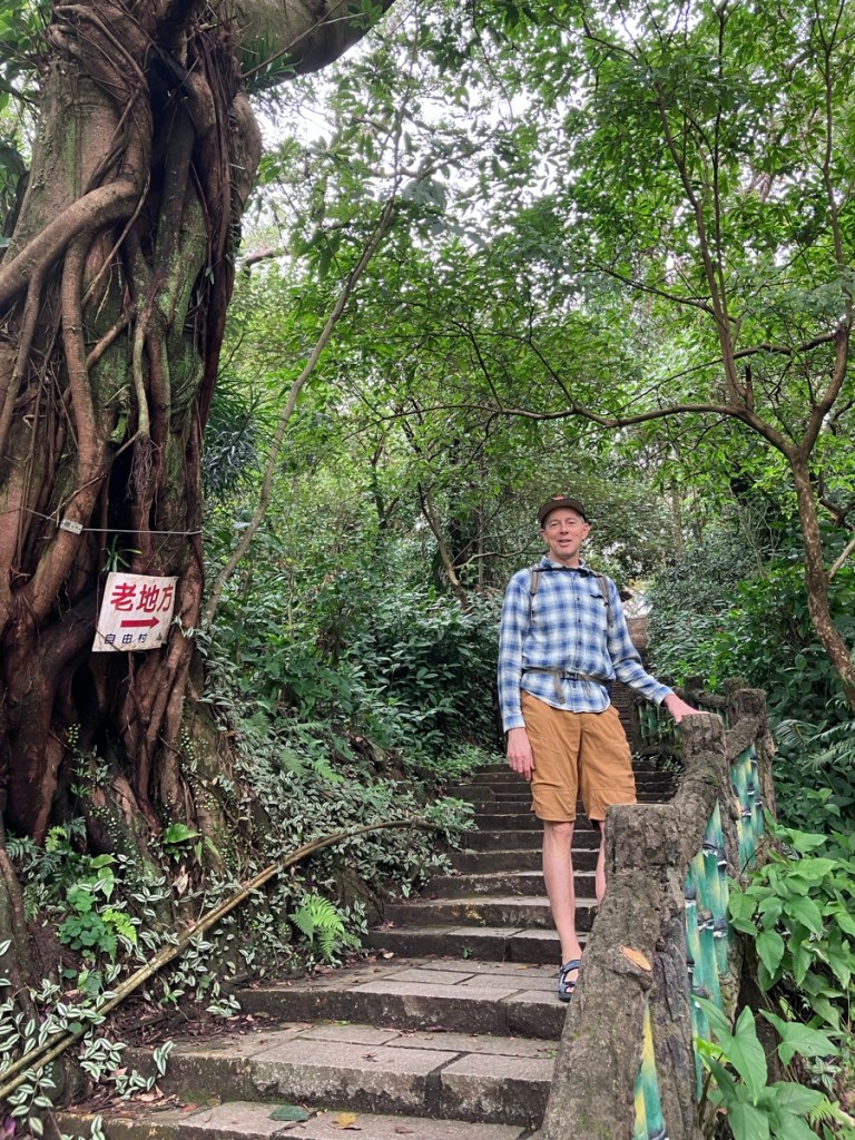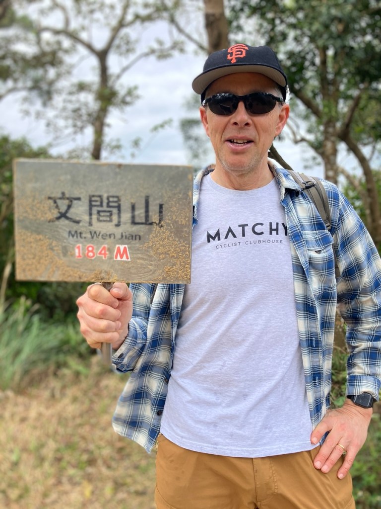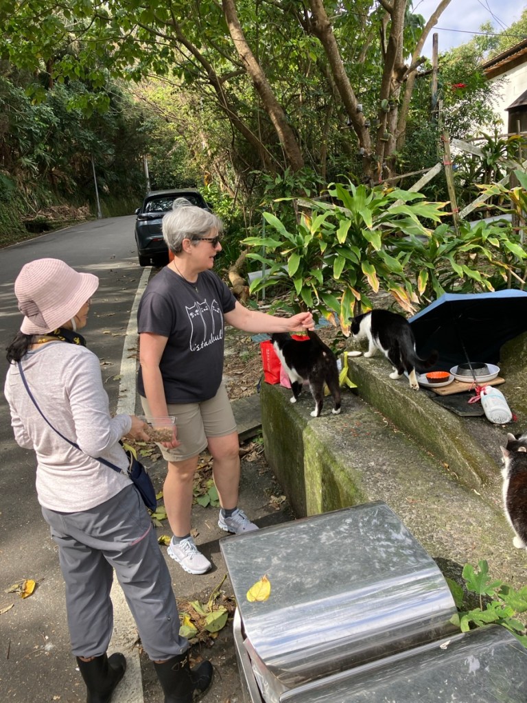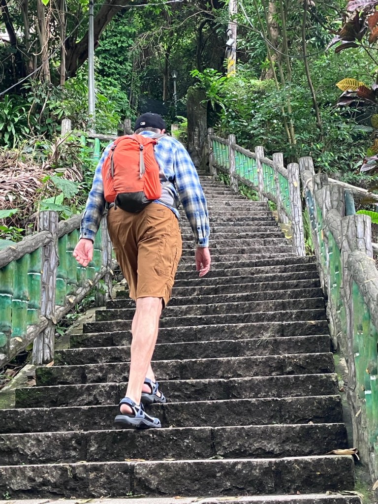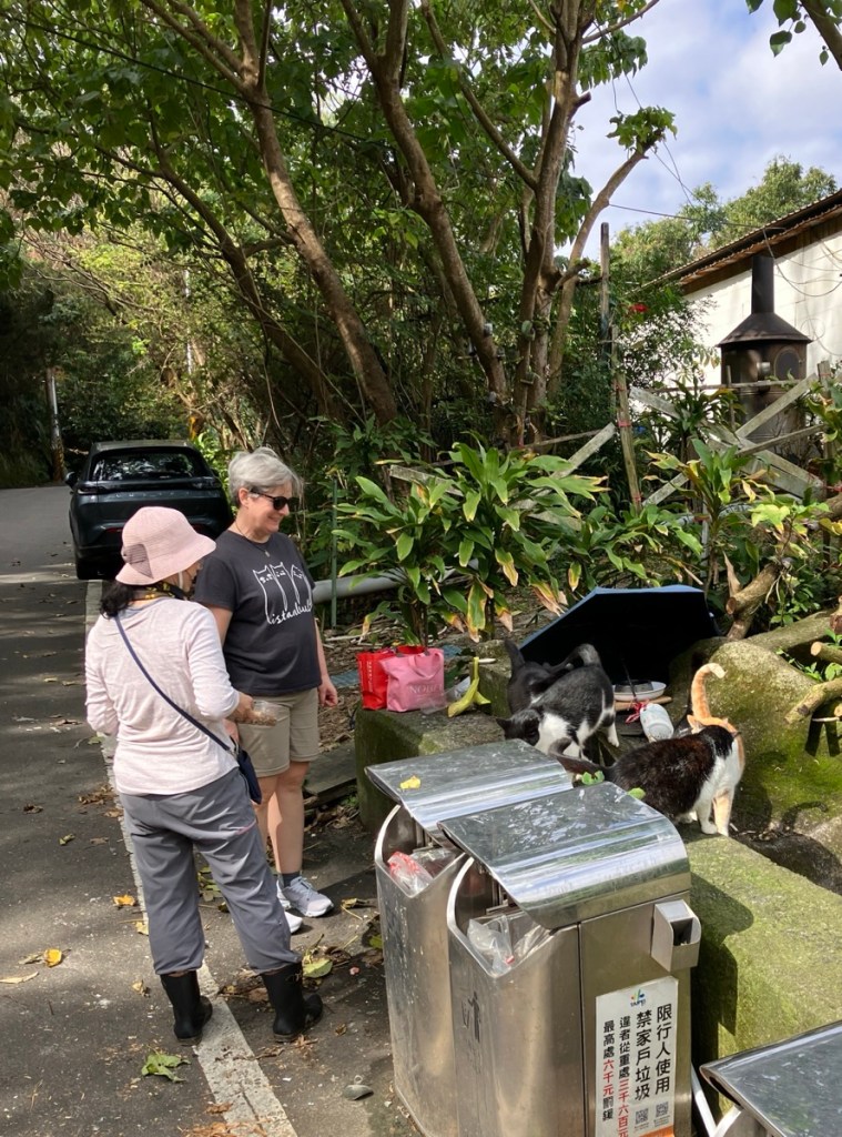 There’s the shirt. Over a yummy savory breakfast at the hotel.We decided to hike the mountain trail across from our hotel. We felt in need of some good step climbing. We headed out about 8:30 am.You will notice that photos of me are taken as I’m trying to keep up. Usually of my front. And his are of his quickly retreating back as I hurry to catch up. Bonus kitty at a temple. On guard.We think this branded signage is new. Taipei Grand Trail. 92 kilometers along Taipei’s scenic peaks. This section was quite popular on this Friday morning with other retired folks. We were glad it wasn’t a weekend.Lots of viewing platforms.And little signs to hold up as you took photos. It says The Usual Place.Another sign and two happy hikers.Near a graveyard, a place to sit. It’s being consumed by the tropical foliage. Some view.Yup, it’s a Grand View.Another sign.And a lovely woman feeding the feral cats.I had to get involved. Caused a bit of a cat fight though.Heading down to catch a bus back. Cross the river.Noodle lunch at Captain Wang’s Sauce Sauce Noodles again. So good!