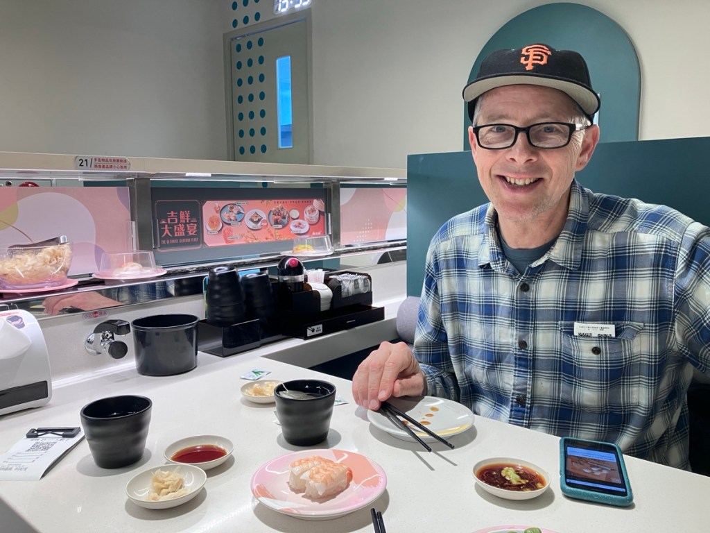 Conveyor belt sushi! One of my favorites. The Taiwanese aren’t too rigid about eating times, but many small restaurants do close between 2:30p and 5ish.While Rich is figuring everything out, trying the app based order system and identifying dishes, I’m scooping plates off the conveyor and chowing down! With unlimited pickled ginger.The little train delivers your app based orders. Good sushi and very reasonably priced. We had a good feast for about $20.