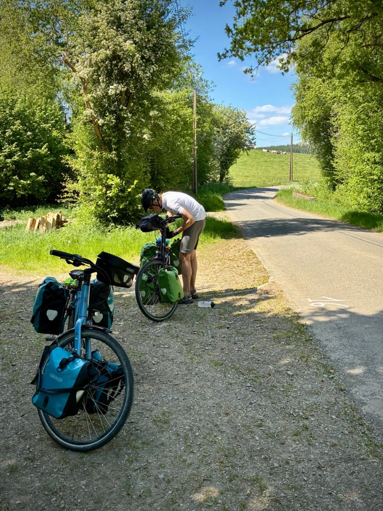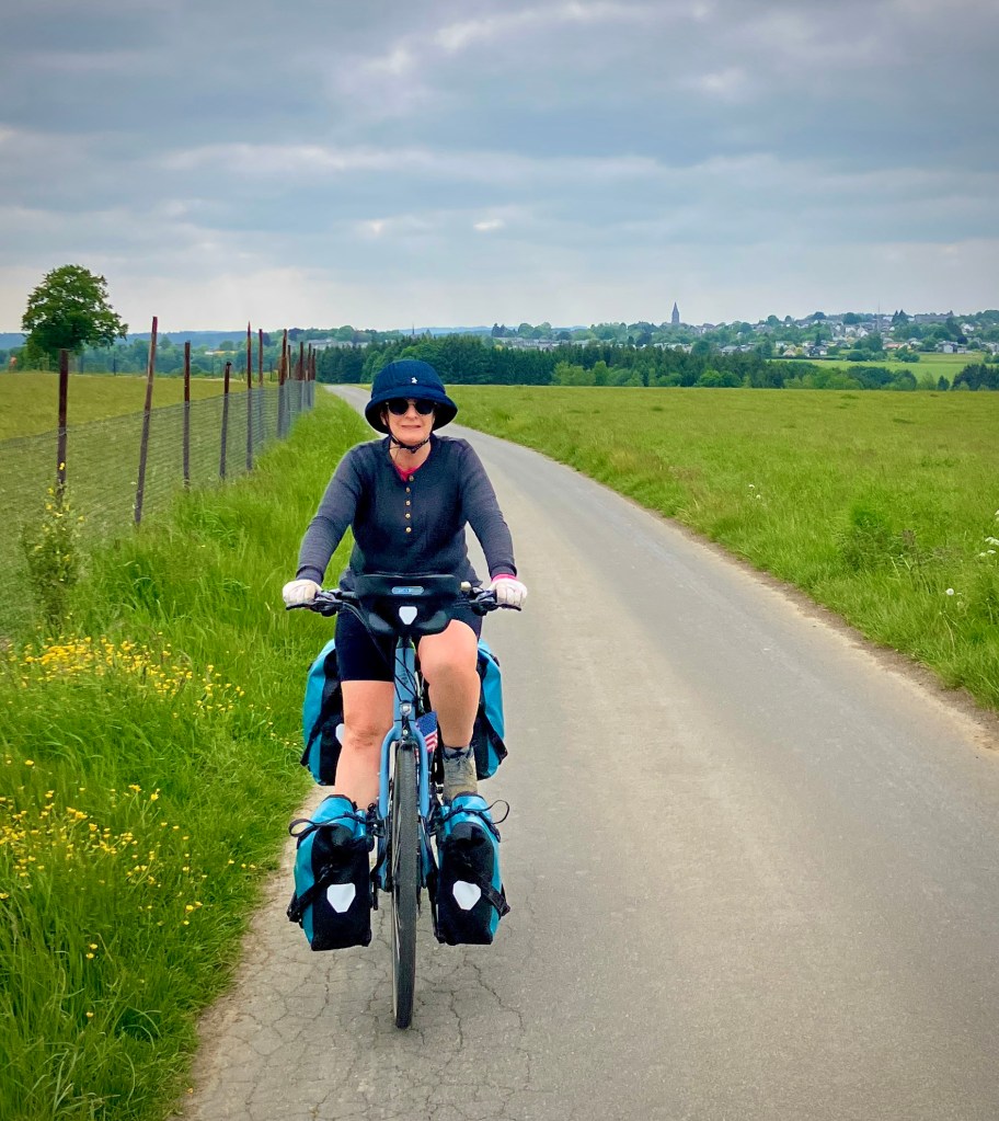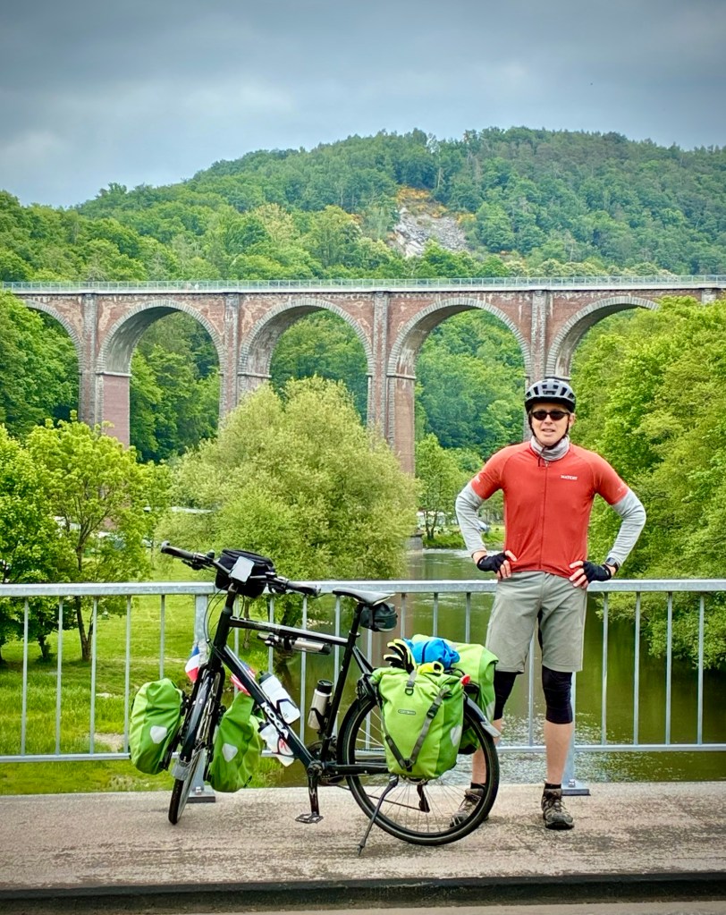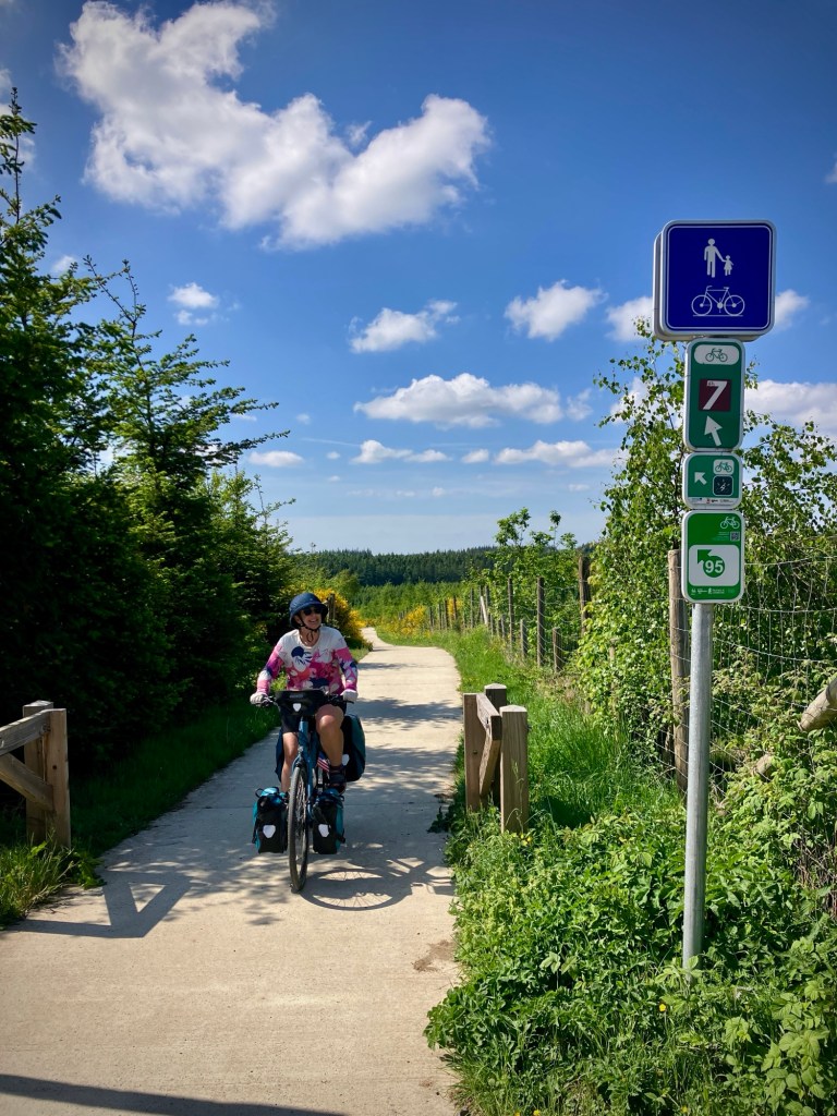 I wanted to see this beautiful rail viaduct near Bertrix, so we opted for a hillier route off the RAVel for a bit. Smiling at the top of one of the many climbs in the Ardennes