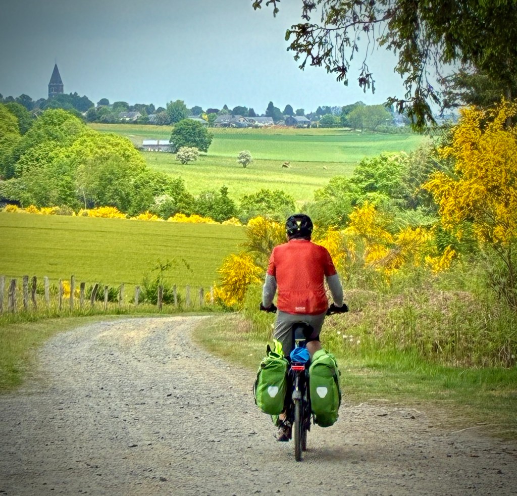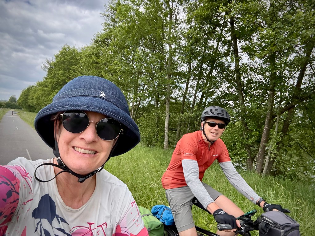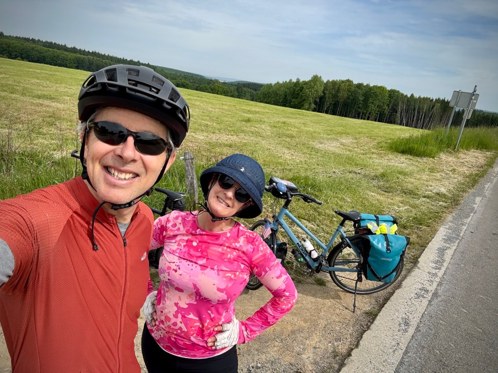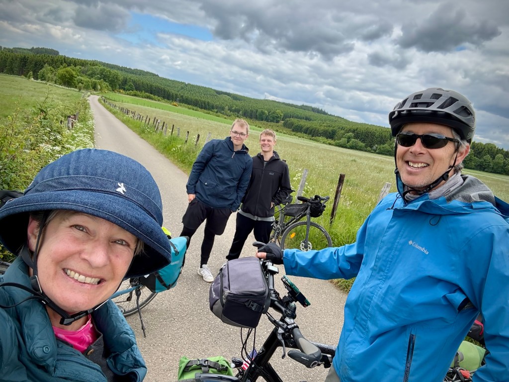 I wanted to see this beautiful rail viaduct near Bertrix, so we opted for a hillier route off the RAVel for a bit. Smiling at the top of one of the many climbs in the Ardennes
