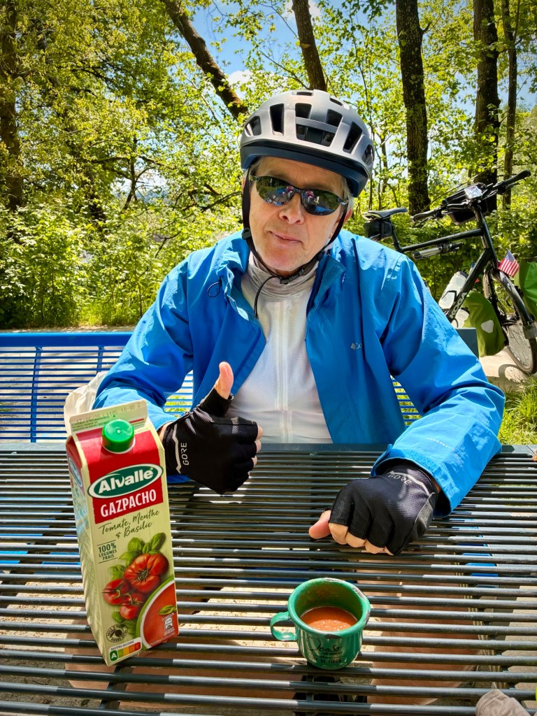 Climbing through commercial forests outside of Libramont. The drab monoculture was offset by the beautifully smooth new concrete path.The high point at an eye watering 560m! Ok, the Ardennes are not a high mountain range. But the buttery smooth pathway decent and rollers through lush mixed forests was a blast.Our favorite Gazpacho flavor currently; Tomato, Mint, and Basil