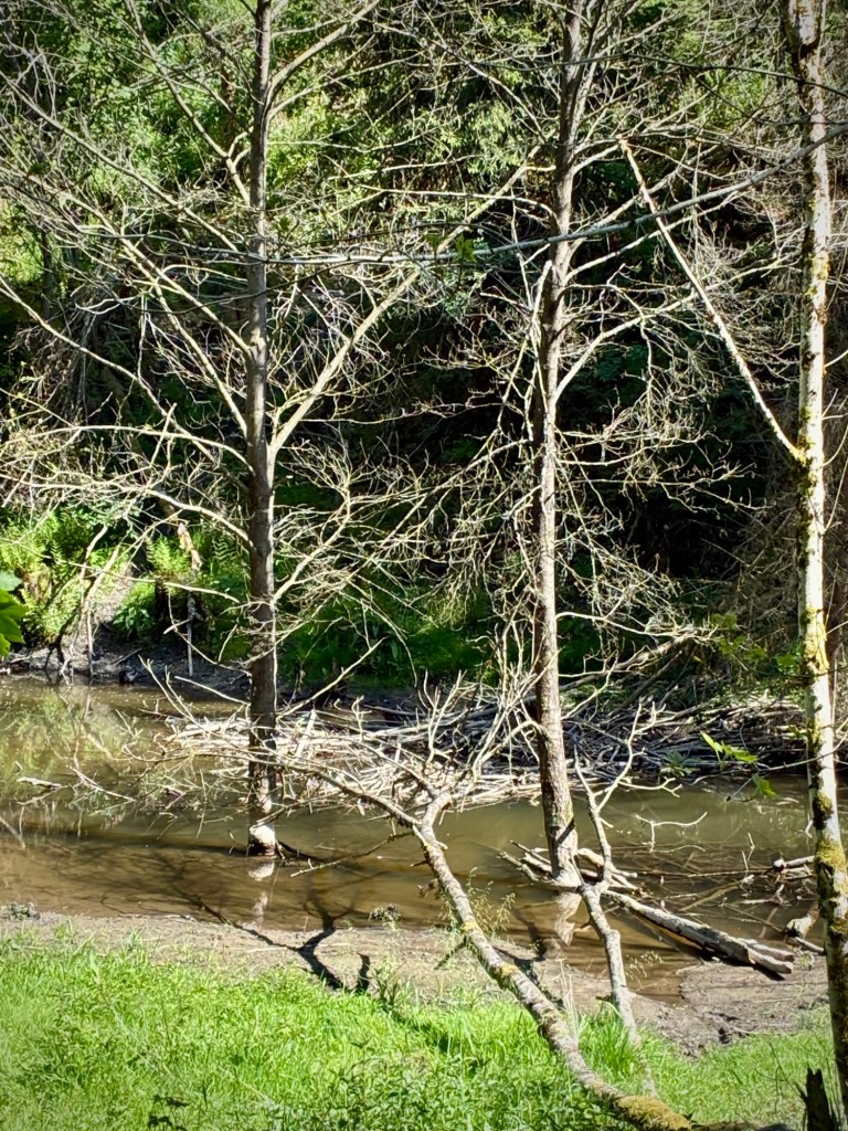 The entire area was the front lines of the advancing Germans after the battle of the Bulge. Virtually every village had a story of war, occupation, suffering, destruction, more war, and finally liberation in early 1945.What are you looking at?More ups and downs on the way to La Roche, but the weather was perfect.A typical quick picnic lunch of luscious pate, healthy sweet potato hummus, cucumber, and seeded whole grain crackers.Our final approach to La Roche had miles of Beaver habitait along a small tributary stream to the Ourthe River.So it was not the best time to spot one of the diurnal European Beavers, but the evidence of their work was everywhere. like the trees gnawed and ready to fall, and many dams across the stream.Reattaching my bottom water bottle cage after a full bottle flew off on a fast and bumpy decent. I was lucky not to go down as I might have if it had gone under my wheel. Reminder, check all the bolts on the bikes!