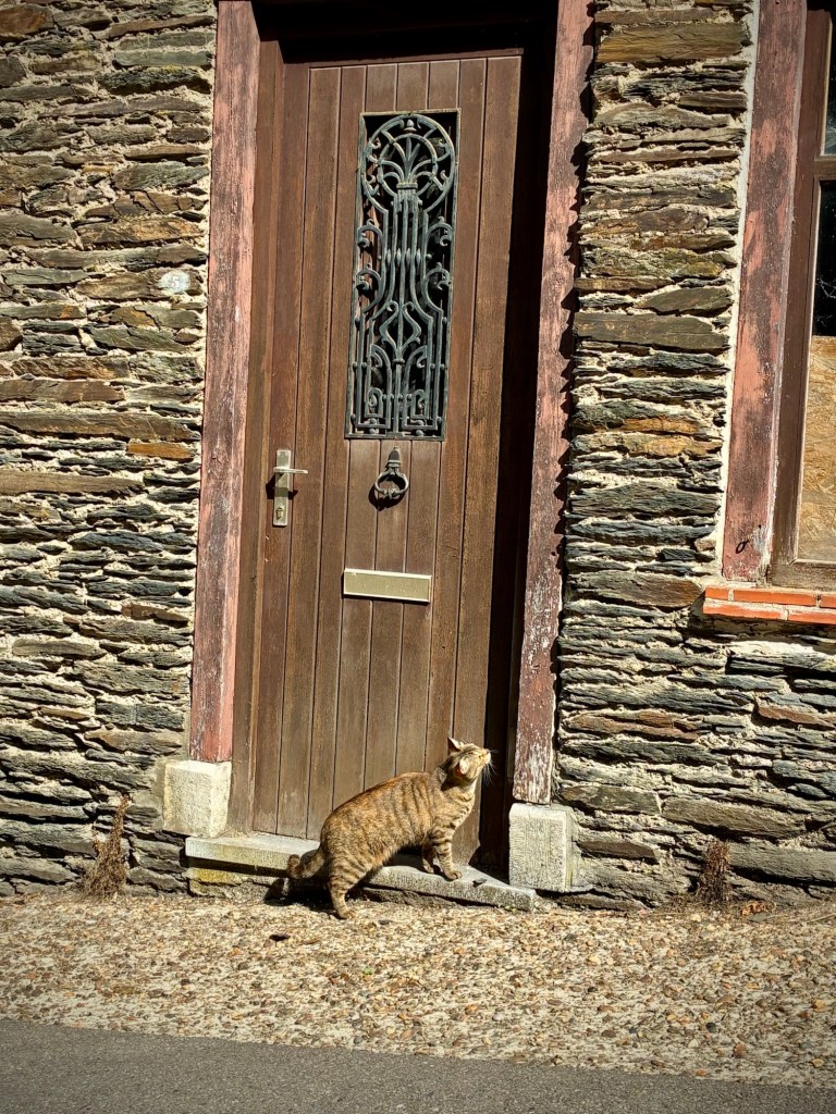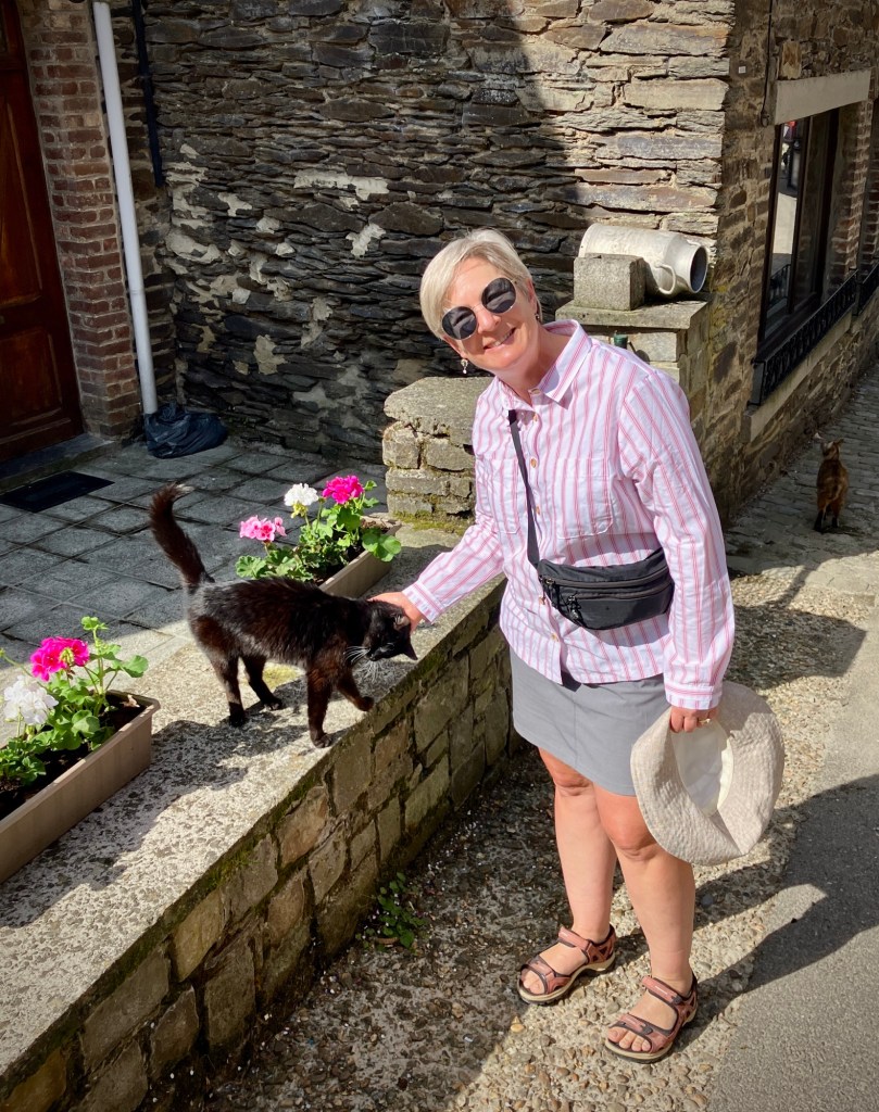 Happy for a day off the bikes in scenic La Roche-en-Ardenne.Exploring the small and fairly charming La Roche, including the local cat population.Is this cat trying to escape from Cheryl?The local Charcuterie…the reformed pigs were a little creepy to me.