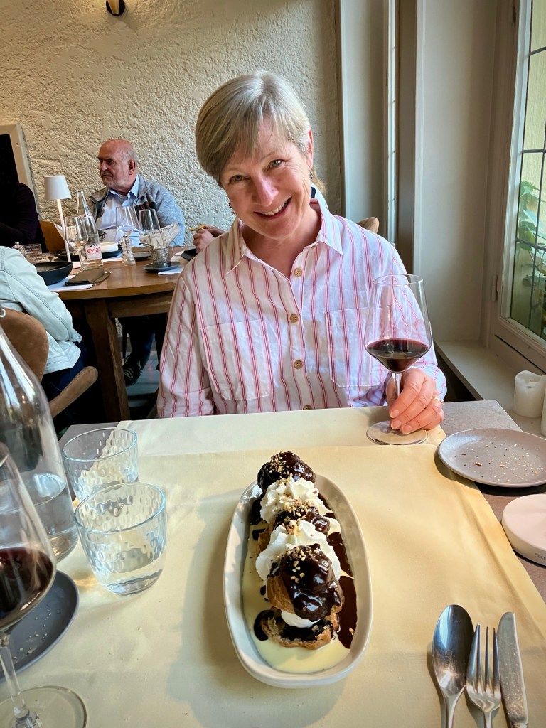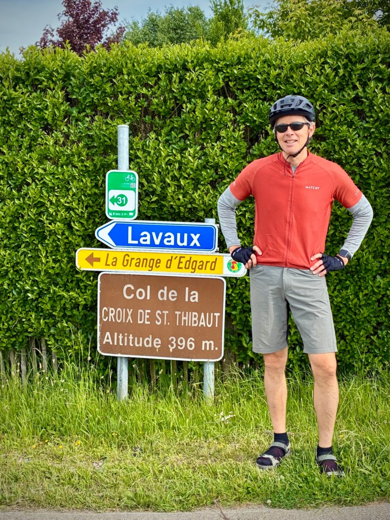 Nice to be touring again after our 4 day break in Paris Where are we going? Briefly on the popular Meuse cycle route, now also Eurovélo 19.The history of WWII in the region still feels fresh and even more interesting as you traverse the same landscape as advancing or entrenched forces. So many buildings were occupied by the Germans and repurposed, while others served the resistance.Cleaned up and with our best shirts on for a Saturday night dinner at the Hôtel la Sapinière. Our usual French restaurant trick is I get the 3-course menu and Cheryl just a main plate, and we split appetizer and dessert.Cheryl looking fresh and lovely in her new shirt. I think splitting dessert was a good idea.