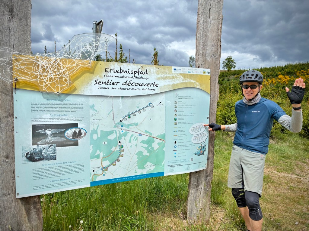 Cheryl trying out some local bike art next to a brief local history on the occupation, resistance, and use of the local farm houses during the war. Everyone and everyplace in this region was in the heart of the long struggle. Yes, we felt pretty welcome in this corner of the world.We were now on the Vennbahn for a while, a long distance route from Liege.As they refurbished the rail line, they discovered numerous bat species in the Lengeller tunnel. It’s closed to people now and they have turned both approaches into an informational journey. Bats are cool, so we were happy to divert.On the steeper pass road, we met these two nice young German guys out for a week of bike packing and camping.And swapped cameras to get pictures of the sticker laden border sign to Luxembourg.Passing under our first train station in Troisvierges, the southern terminus of the Vennbhn. I had to check out the nice departure screens and fact that all the trains and buses are free! All the time, everywhere. Very exciting!We arrived in sunshine to Clervaux, Luxembourg, and its beautiful church which looks ancient but was actually built in 1912.The Church of Saints Côme et Damien is just as impressive inside. Incredible quality and workmanship which was an effort to boost and promote Clerveux’s status as an economically successful village.The Clerveux Castle is in a dramatic spot on a bend in the Clerve River. It now houses a war museum and is permanent home to the Family of Man; a impressive presentation of 512 black and white photographs collected by Edward Steichen in 1956. Its focus on the commonalities of the human experience around the world felt especially poignant to us with Trump’s administration of uber-nationalism.A simple but effective monument to the American GIs who liberated Luxembourg twice from the Wehrmacht.And the townspeople cheering on their liberators.Waiting for our first FREE train in Clerveux, Luxembourg.Multiple bike cars, level boarding: and horizontal placement of bikes! (No hooks!!) Luxembourg spends even more than the Swiss per capita on train infrastructure.No tickets, no worry about missing a train. I think I like this!After our FREE train hop, a short ride today to our hotel near our cat sit. All on excellent cycle paths and routes. Have I mentioned all the trains are free in Luxembourg since 2020?!!Today’s ride was perhaps a bit too short so we had to kill some time along the river in our Chair Zeros.My first Battin, the de facto National Beer of Luxembourg. A pretty tasty lager with a malty and satisfying finish.