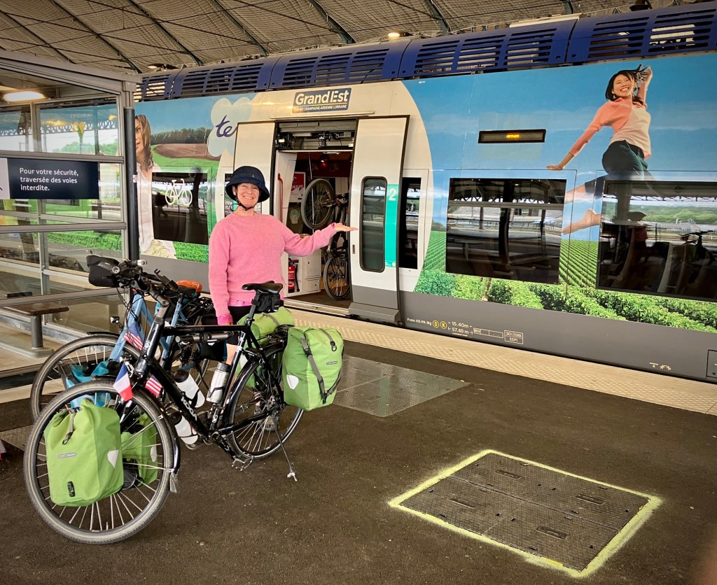 After our TGV to Reims, this lovely Grand L’Est regional train to Charleville-MézièresReims had some tight elevators but smaller Charleville-Mézières had really small platform elevators. I took stair rails down, while Cheryl opted for turning her bike upright in the elevator. By the way, a heavily loaded bike can slide out of control on the metal checker plate, especially if anything is wet!But hey, a new elevator up -:)