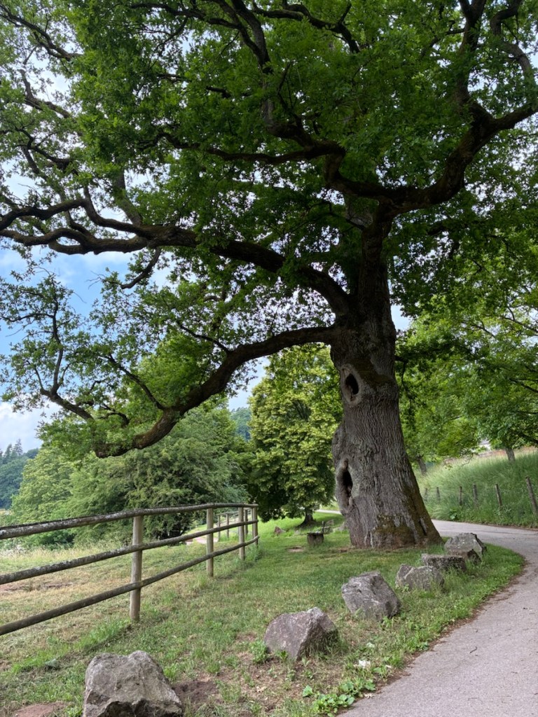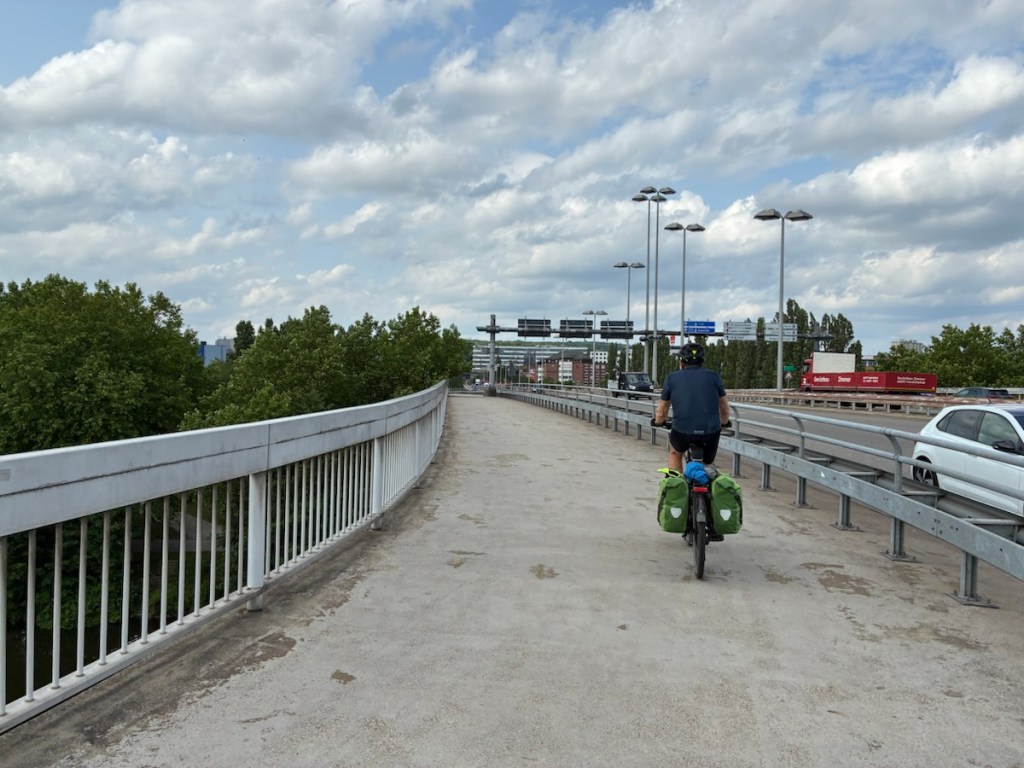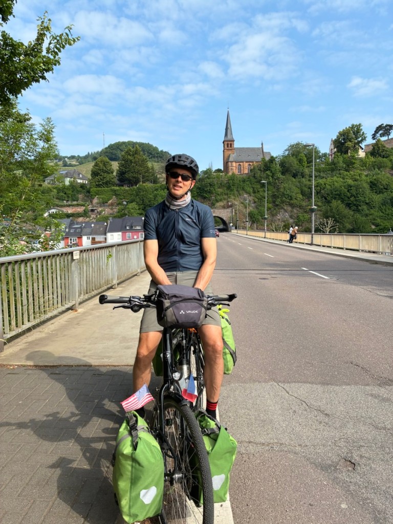 The Wasserfall Saarburg. Makes a lovely backdrop and sound for the restaurants and cafes. More impressive is the fact that this was a 13th century project to redirect the Leukbach River through town.The buildings rise right up from the river.The sound of the waterfalls and the cool air rising from the river are lovely.On our way out of town after a one night stay. That look says, can we just ride and not stop for photos every five minutes?Heading out along the Saar River. It was a calm morning, no wind.My dashboard. Many podcasts have been played on that Bluetooth speaker over the weeks of bike touring. Germany can be relied on for good paths linking you from city to city, town to town. We’re up from the river on this stretch by an industrial site.We headed up and over a hill to avoid a big bend in the river. Shortcut? Eh..it was steep so no real time savings, but what a view.Could this tree be any more classic and beautiful? Big sweeping limbs, check. Picturesque hollows offering tantalizing home for small furry creatures, check.Ah, the bike signage of Germany.Ah, the pastries as big as your head of Germany.