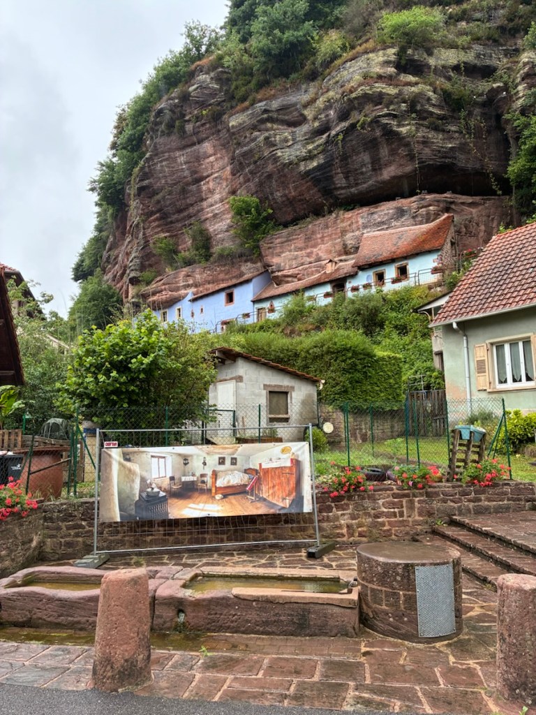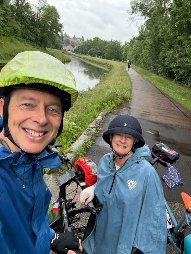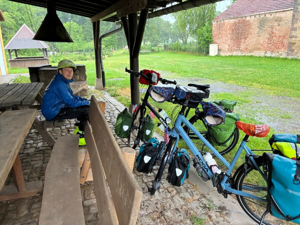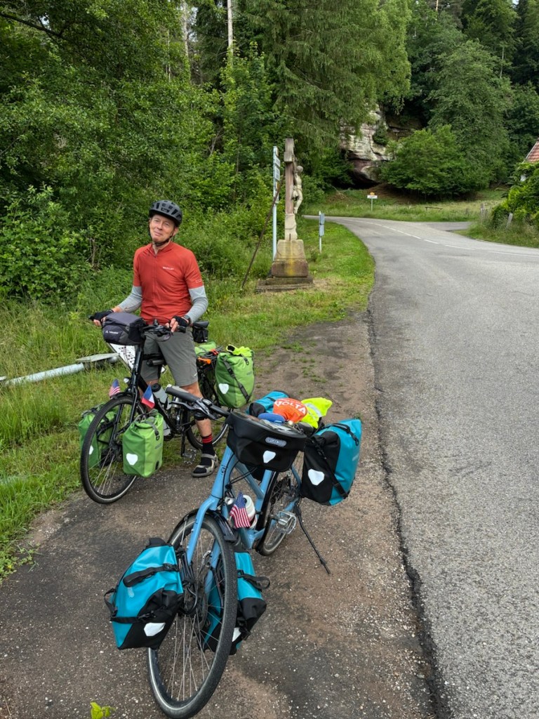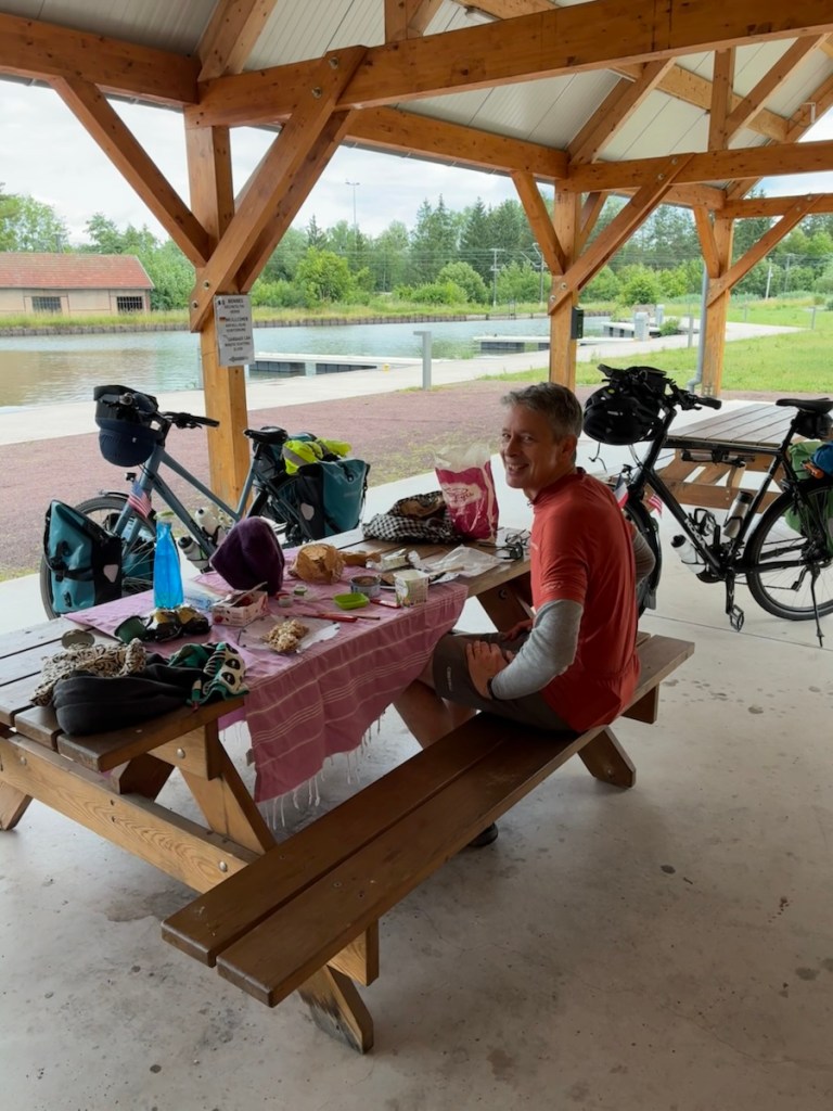 Over the bridge to our destination for the night, Saarbrücken.Recovery beverages for the win!What’s the easiest bike parking? In our hotel room. Doesn’t happen often but boy it’s nice. Roll in roll out. In this case it was roll out into a steady rain.Never stop smiling. We’re headed 25k to a train station to take a hop to shorten the day.Off the train at Diemeringen and we’re back in France! Feeling sassy. Drinking Sassy French cider at a Breton crepe restaurant lunch break to avoid the storm.We don’t often stop for a sit down lunch, but we had hoped to hunker down and avoid the worst of the storm. Delicious crepes. Very friendly locals.The rest of the day cycling was a series of hops to shelter from heavy rain. Overhangs at town halls, under a barn roof, and this community park with a covered picnic area. The storm moved slowly across the region so we didn’t avoid much of it, but we managed to duck out during some particularly heavy bits.We rolled into Eschbourg and marveled at Maisons des rochers de Graufthal. These houses were built into a rock cliff and the last inhabitant died in 1958. It’s now a museum.