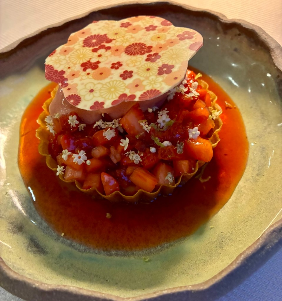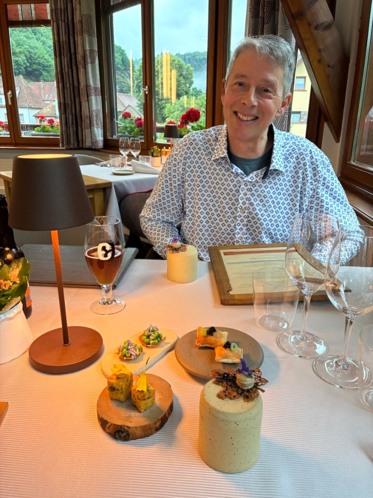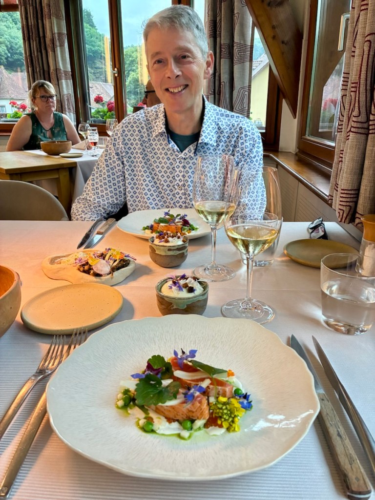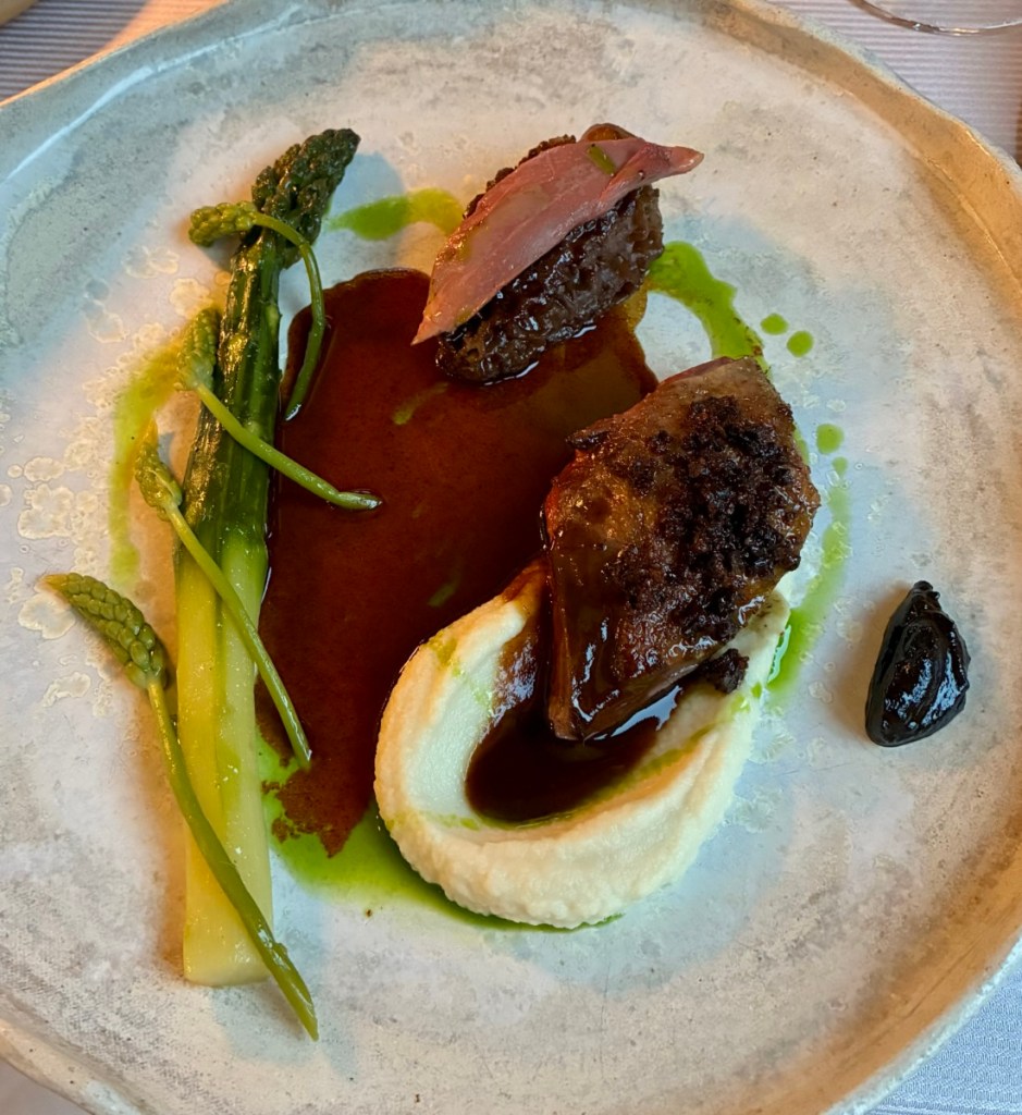 The largest green leaves are sorrel. The wine pairing was a delicious Riesling.Get used to eating tiny flowers. The mousse was flavored with ground ivy.Barbecued white asparagus, paired with Cote du Rhone Amour de Fruits.BBQ white asparagus with pistachios and pith of citrus. Amazing.The squab course, served with Le Migmatite Gamay Sur Granit. Which translates as delicious red wine. Düwehof pigeon breast, thigh with giblets, porcini mushroom praline, green asparagus, stuffed morel and wild garlic, Mokxa coffee-infused jus. The wild garlic is the small dark lump, it’s cooked in a rice cooker.Pigeon thigh with giblets. Yes, very rich this course.The palate cleanser, rhubarb sorbet in a delicate apple and herb sauce.With the dessert course an elderflower cider, Cidrerie de Reillon Grégoire Jacquot Fleurs de mal 2023 • Pétillant de miel. Strawberry horseradish ice cream, and a white chocolate top. Sprinkled with little white flowers.And finally, more little dessert treats. Raspberry tartlet, and a small Financier Cookie.Chocolate truffles on a bed of cacao nibs. It was a good thing we’d been bike touring for almost 70 days and our metabolisms were running high.