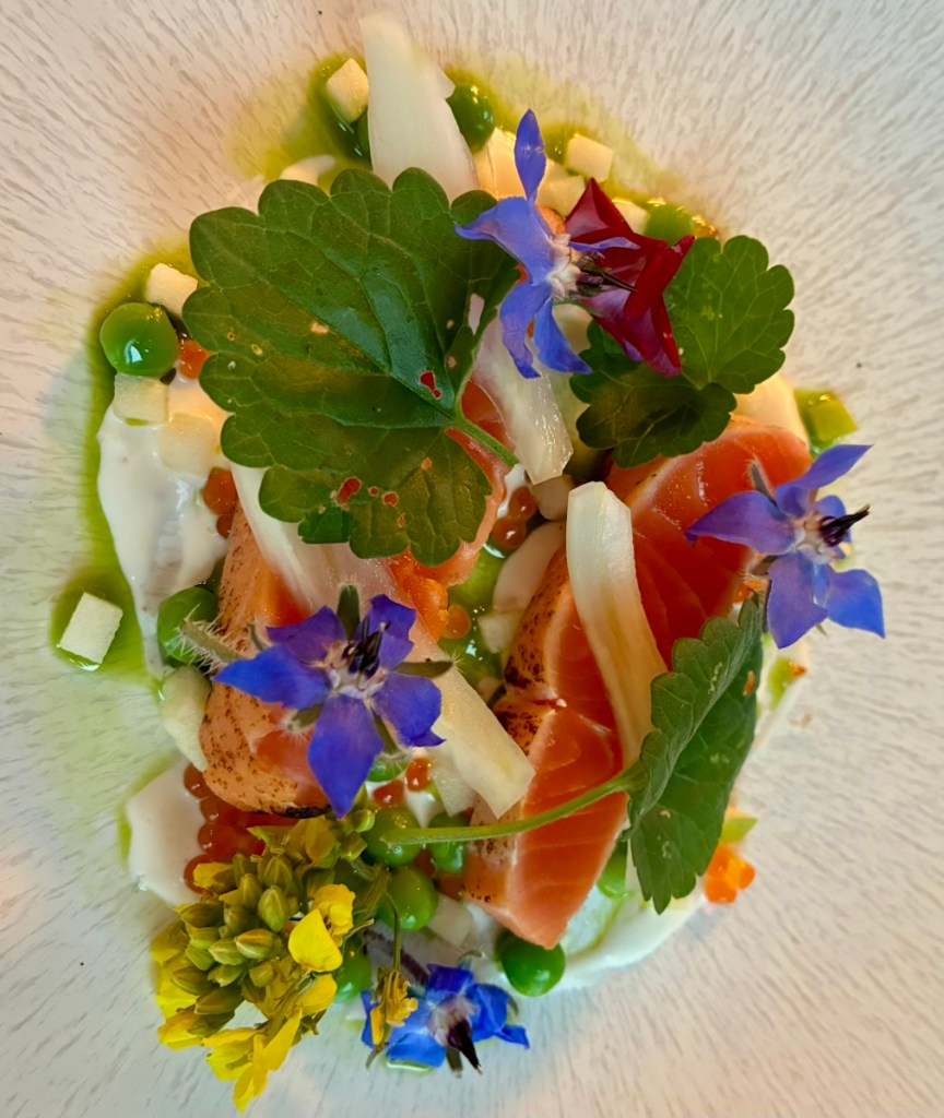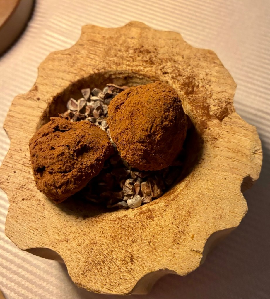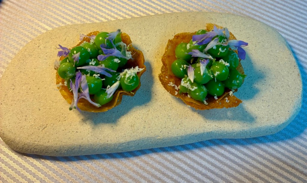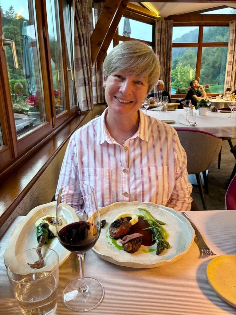 The largest green leaves are sorrel. The wine pairing was a delicious Riesling.Get used to eating tiny flowers. The mousse was flavored with ground ivy.Barbecued white asparagus, paired with Cote du Rhone Amour de Fruits.BBQ white asparagus with pistachios and pith of citrus. Amazing.The squab course, served with Le Migmatite Gamay Sur Granit. Which translates as delicious red wine. Düwehof pigeon breast, thigh with giblets, porcini mushroom praline, green asparagus, stuffed morel and wild garlic, Mokxa coffee-infused jus. The wild garlic is the small dark lump, it’s cooked in a rice cooker.Pigeon thigh with giblets. Yes, very rich this course.The palate cleanser, rhubarb sorbet in a delicate apple and herb sauce.With the dessert course an elderflower cider, Cidrerie de Reillon Grégoire Jacquot Fleurs de mal 2023 • Pétillant de miel. Strawberry horseradish ice cream, and a white chocolate top. Sprinkled with little white flowers.And finally, more little dessert treats. Raspberry tartlet, and a small Financier Cookie.Chocolate truffles on a bed of cacao nibs. It was a good thing we’d been bike touring for almost 70 days and our metabolisms were running high.