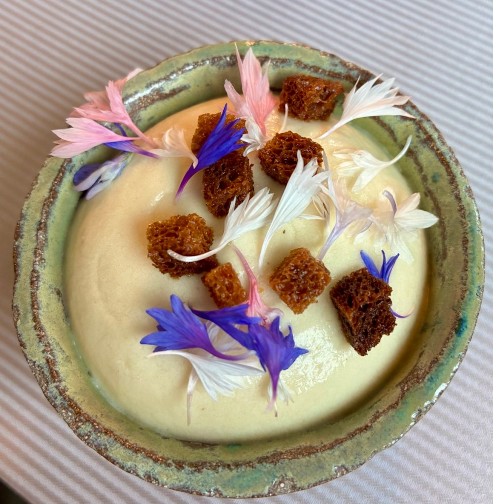 Trying to pay attention to and write down the details of this meal gave me so much respect for actual food writers. Ground ivy, the waiter said, I dutifully wrote that down and only now looked it up: Glechoma hederacea is an aromatic, perennial, evergreen creeper of the mint family Lamiaceae. It is commonly known as ground-ivy, gill-over-the-ground, creeping charlie, alehoof, tunhoof, catsfoot, field balm, and run-away-robin. Thankfully I had snapped a picture of the full menu, since these courses, or sequences, are mostly represented on the menu.