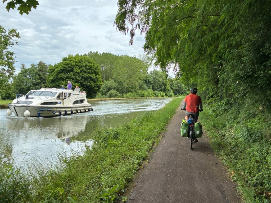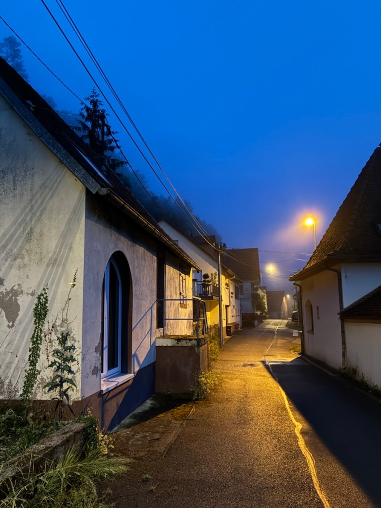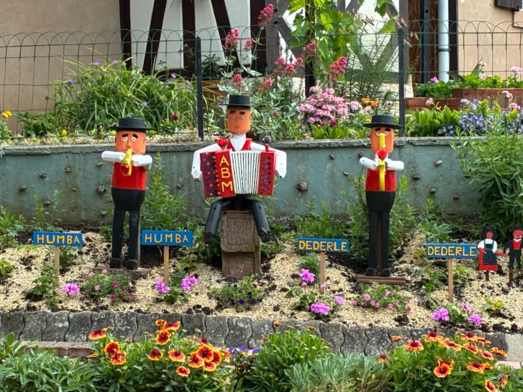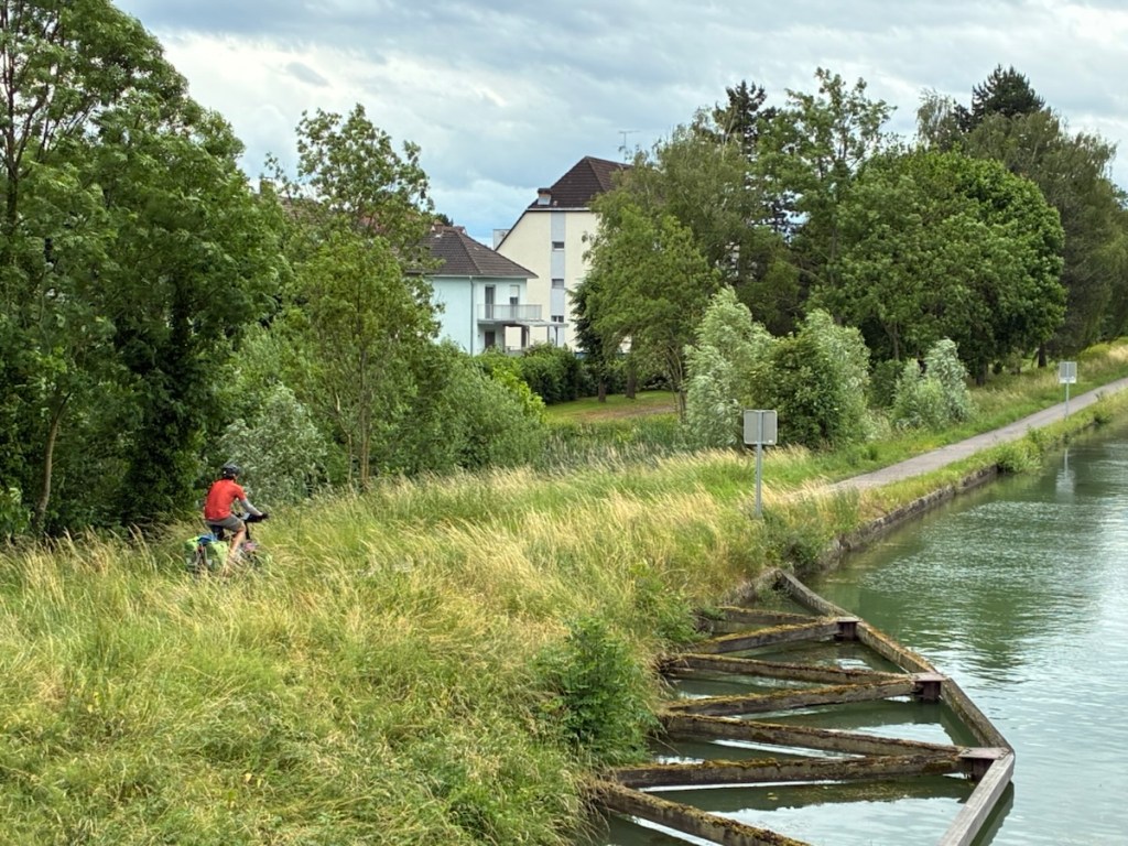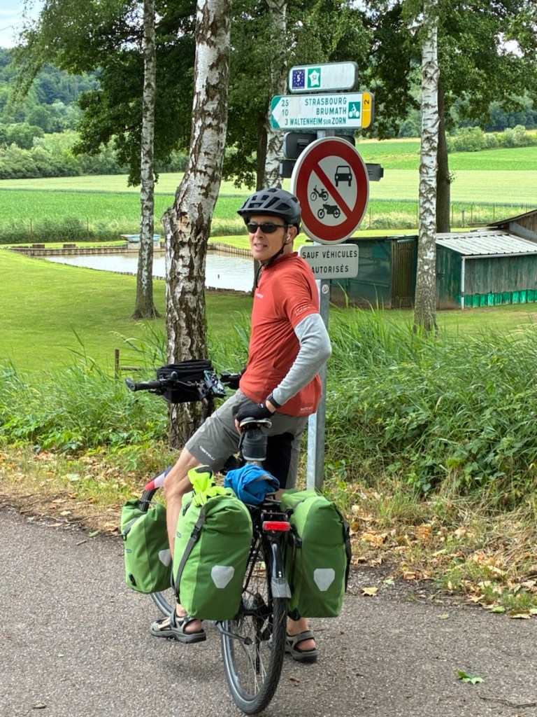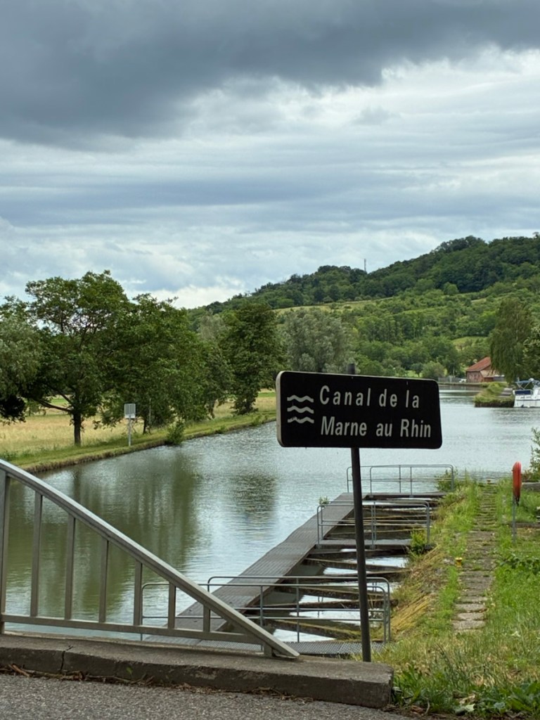 Eschbourg by night.The town church.The hotel and restaurant glowing in the gloom.The rain was over and we were ready to ride again.Crossing the Zinsel du Sud. Watched by a highland cow. Maybe. Are they asleep behind all that hair?We’re riding towards Strasbourg in the French Alsace region. I love the half timbered houses and steep gables. So picturesque. The hanging sign looks like an anvil, was this once a blacksmith shop?What the what? How cute are these musicians? Humba Humba Dederle Dederle. A striking stork against a stormy sky in Ernolsheim-lès-Saverne.Lunch along the Canal de la Marne au Rhin.It’s a popular canal for hiring boats and touring along.Which means we get to wave at lots of boaters and shout Bonjour!25 kilometers to Strasbourg. This cultural region of Alsace certainly has a sense of humor.The canal is taking us right to the Strasbourg train station.