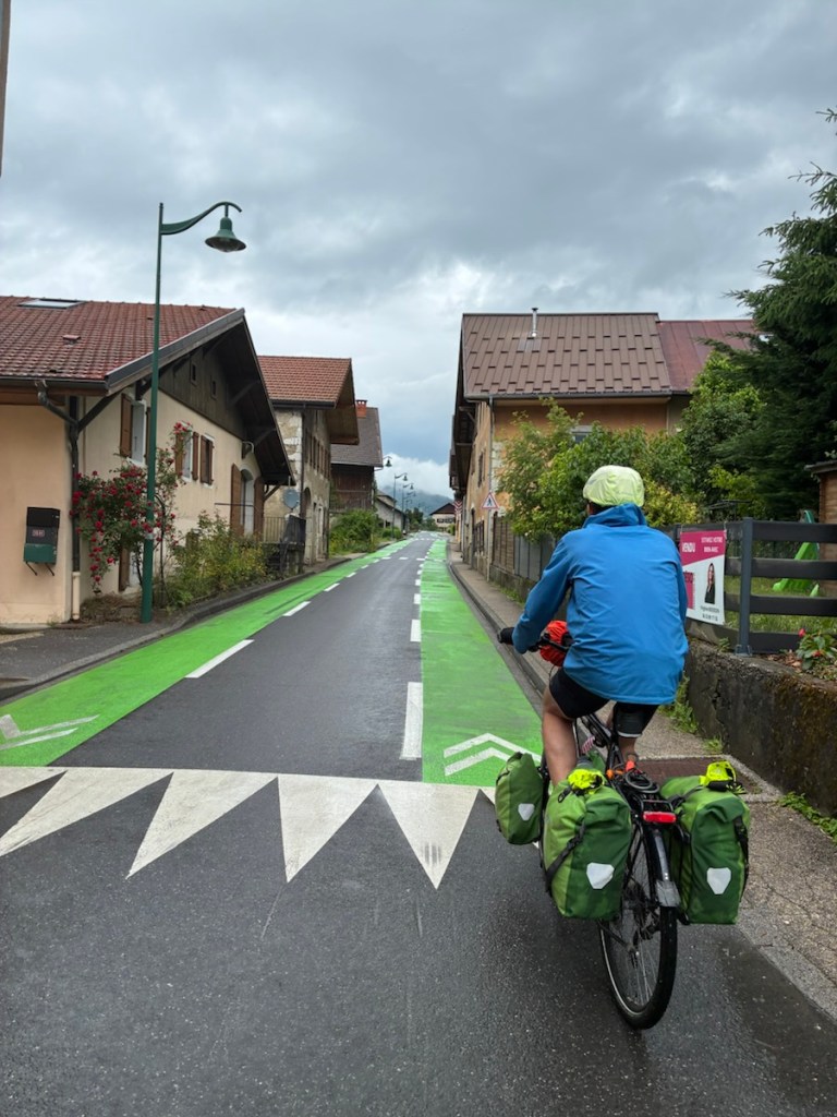 Now that’s a bike path. Loads of regular bike riders commuting to and from Geneva.A fun beer place on a street being pedestrianized in Annemasse.Headed out. Final climb. Will the rain hold off?New lanes popping up everywhere!A climb with a stunning view.Finally eating a very well traveled protein bar. I insisted on eating it since it was about to also complete the 70 day loop.The rain did not hold off, but a playground pergola gave us some shelter.More new bike lanes!Bakery stop! Almost there.The neighbors’ cows provide a welcoming committee. Or at least a gazing with interest committee.Off the bikes and treated to a sunny day.