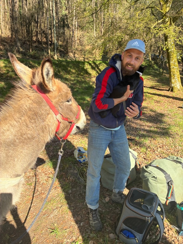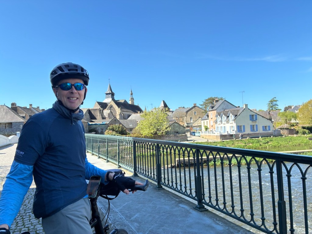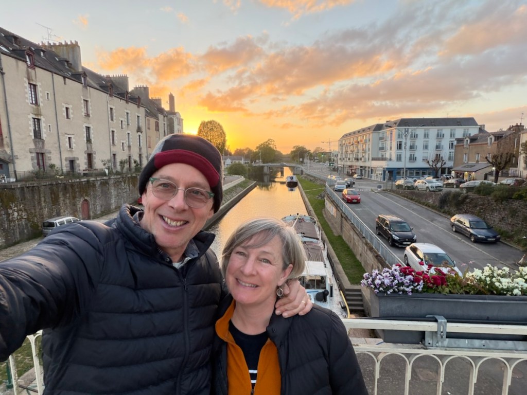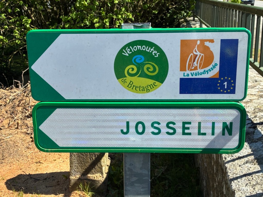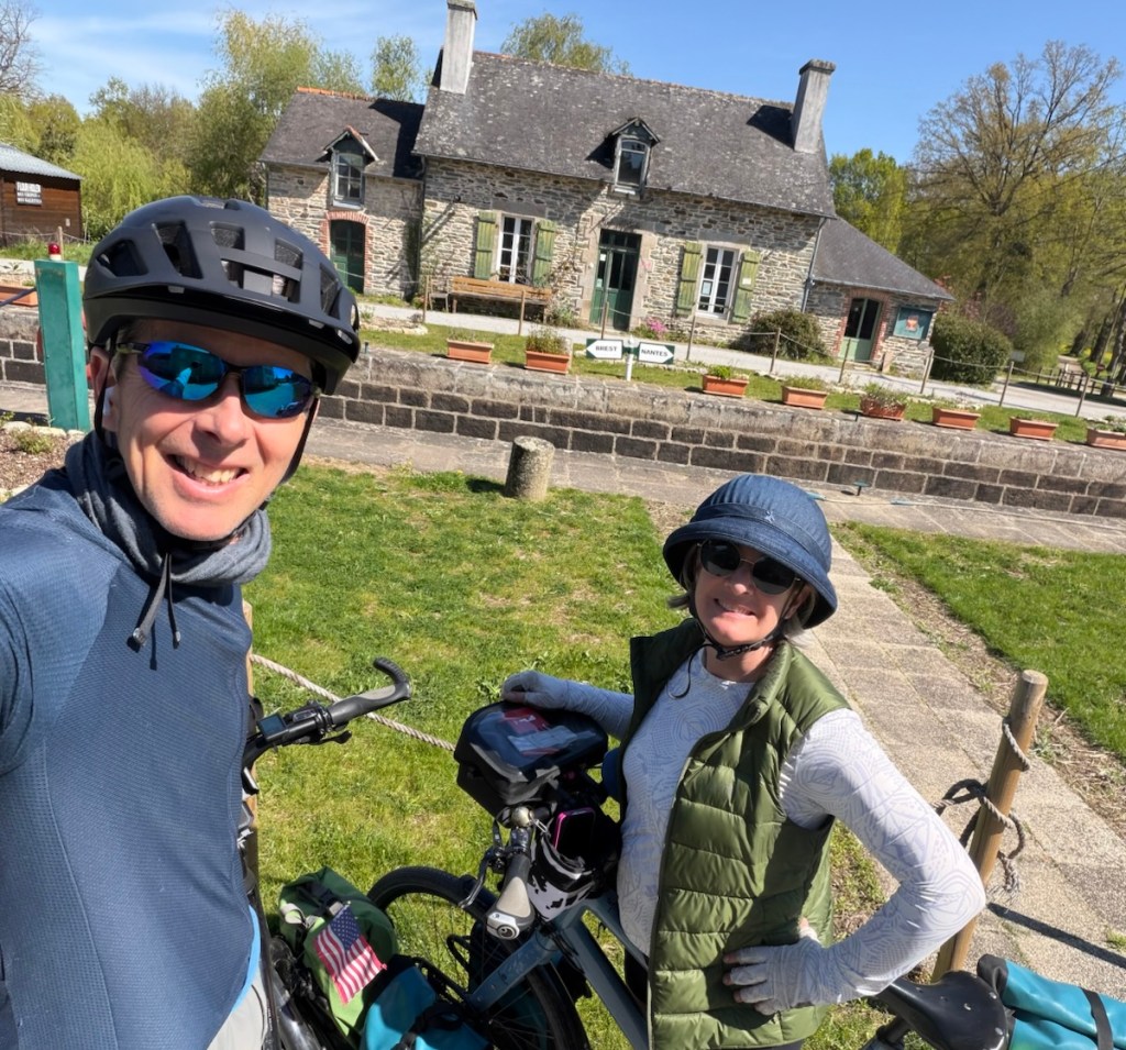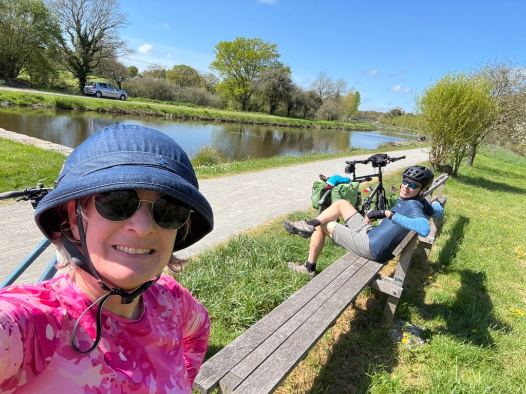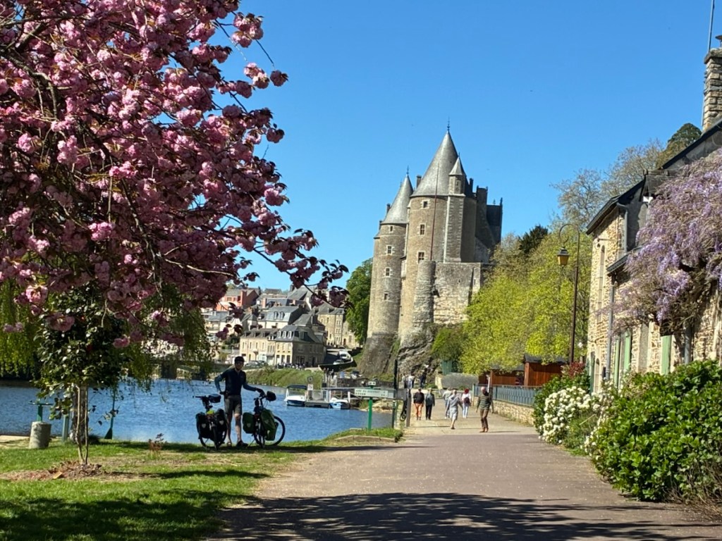 Half timbered building from the 1600s, now with shops on the ground floor, as many were originally both businesses and dwellings it’s fitting.Sunset over the canal in Redon.Nettles. Rich won that bingo square with a “shortcut” suggested by Komoot. Thankfully it was a small nettling. Person traveling with a donkey? Is that on my Bingo card? It is now.I forgot his name, but he had just bought the donkey and he was headed out for a ten year ramble! With his cat too, who is wearing a GPS collar and was not happy about the crazy cat lady wanting to get her hands on him.Lunch. Smoked salmon for Rich and peanut butter and dried cranberries for me.Crossing through Malestroit. This is perhaps one of the most interesting and beautiful canals we’ve ridden.The écluse houses are adorable. The riding surface of the path is mostly really smooth fine gravel.My ongoing love affair with French bike route signage.Château de Josselin. On the Oust River. Still the residence of the 14th Duke of Rohan.