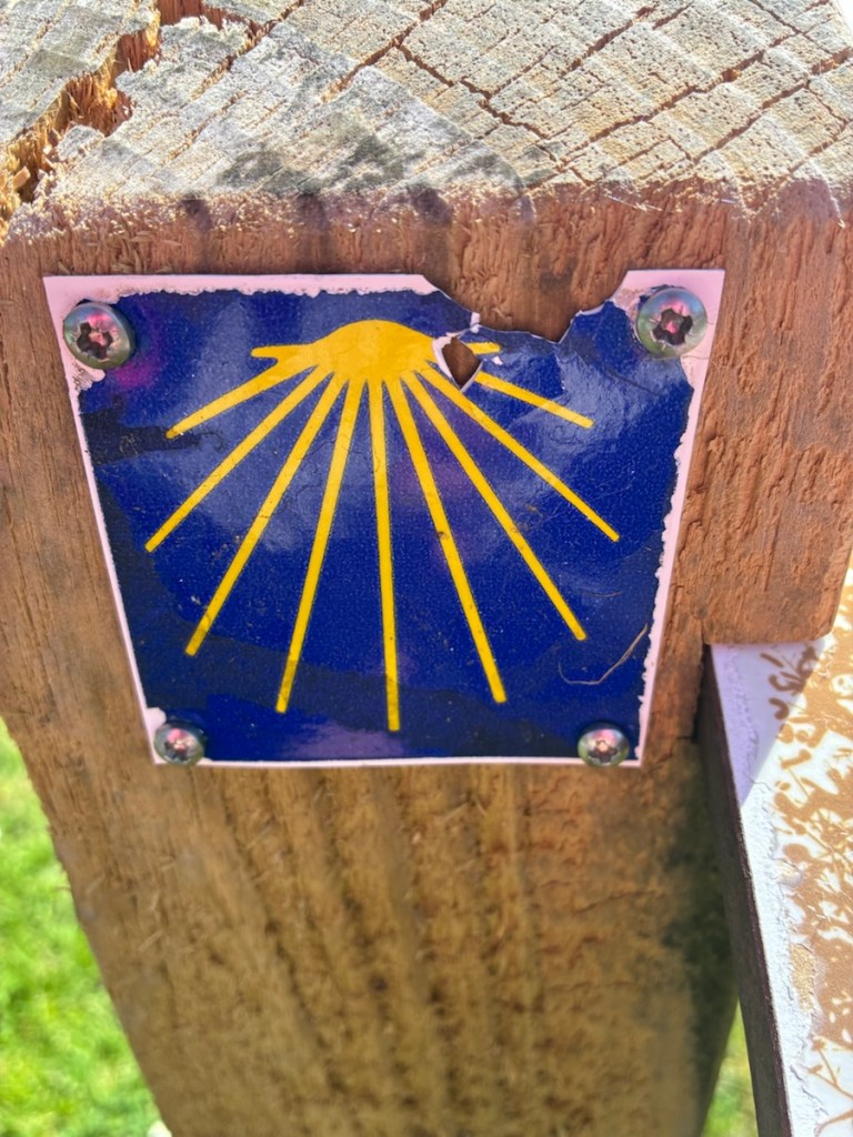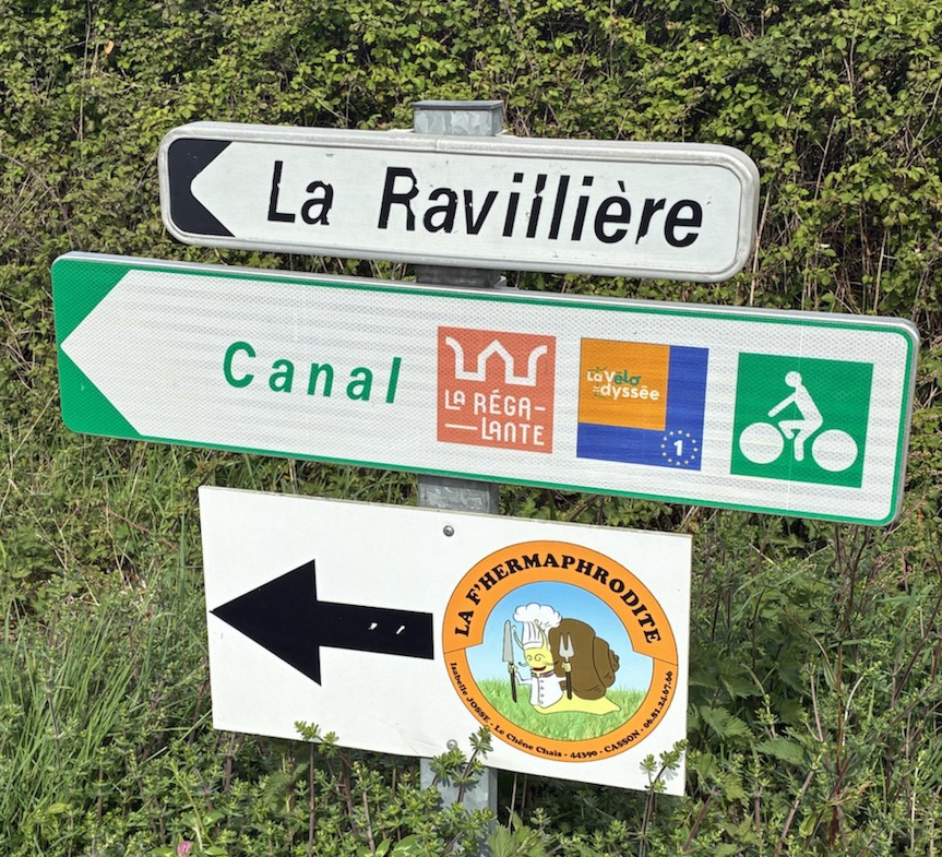 Finally out into the countryside. Canal this way! Oddly named snail restaurant also this way? That sign deserves a bingo square.It’s steadily getting warmer and the day is calm but with a nice tailwind. The travel planner stops to admire a helpful map.Lunch break in Nort-sur-Erdre. We’re appreciating how well benched and picnic tabled this route is. So many benches.We’re on a Camino de Santiago trail. We chatted with one pilgrim and saw two others. They had 1,200 kilometers to walk to Santiago de Compostela, Spain. We’re headed the opposite direction from the pilgrims so merrily we roll along.Bike touring bingo square! French gentleman in striped shirt smoking a ciggy while piloting a boat. I got bonus points the next day when I saw the same guy (I think) having a wee by the side of a marina.Our first night on the canal in Blain at a lovely Chambre d’hôte, Le Nid d’Omer. We’re trying to remember to take photos of our rooms before we dump our panniers and make an ugly mess.Bingo! Well behaved chambre d’hôte cat observing breakfast.
