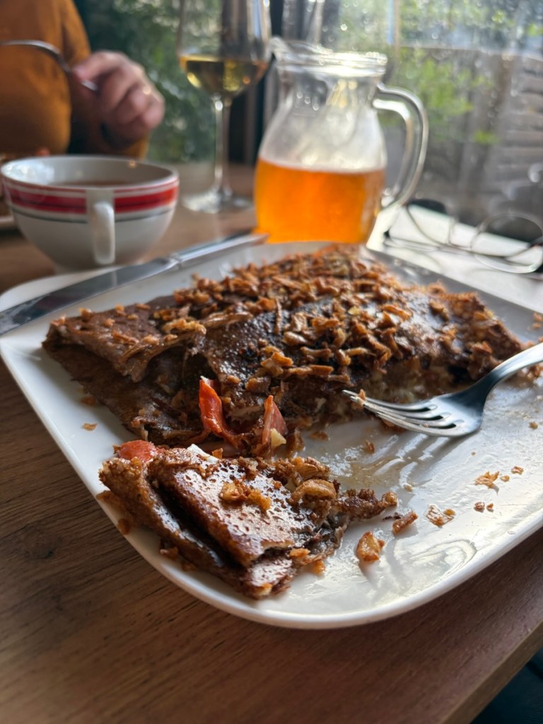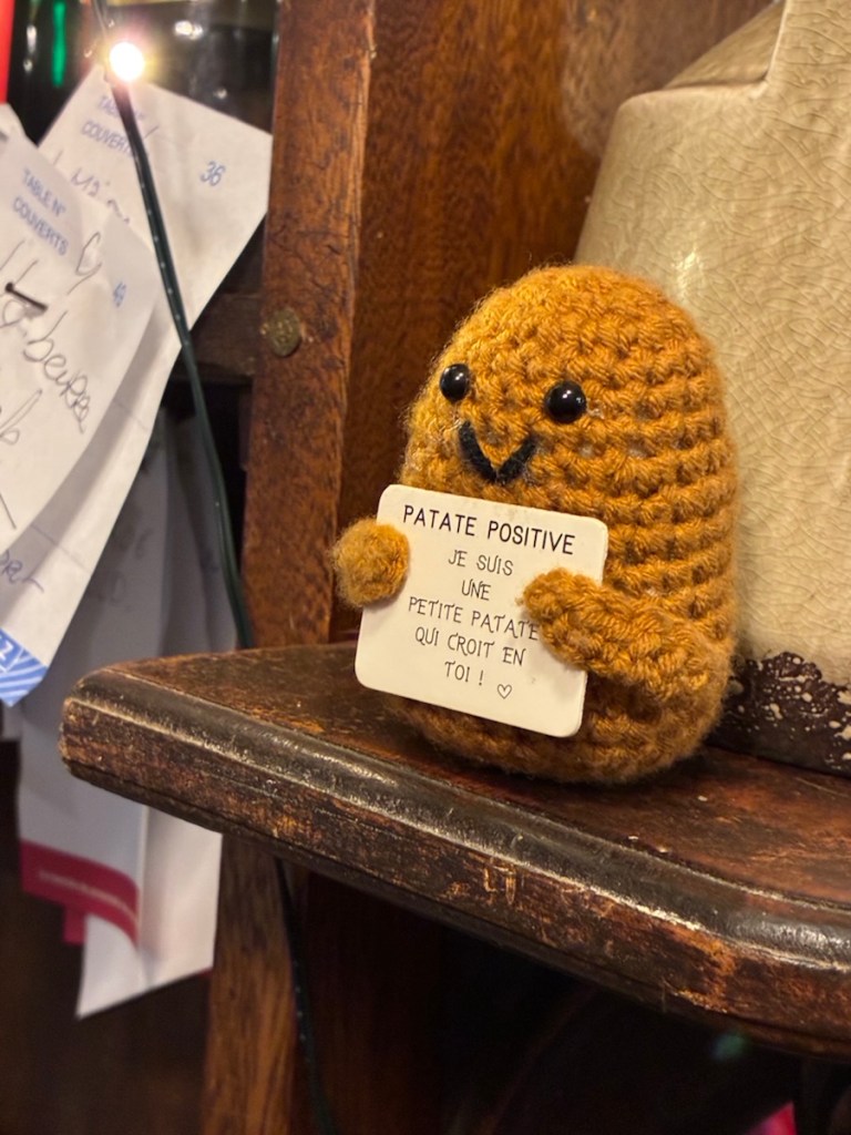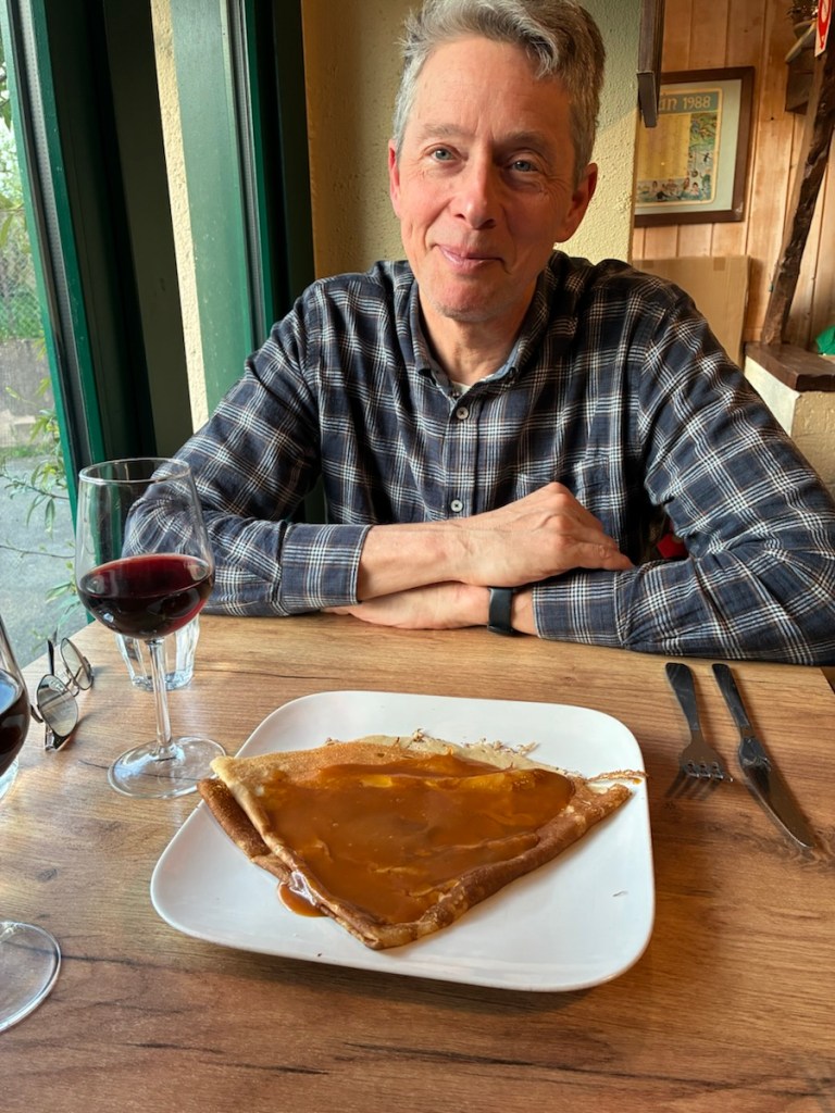 “I’m a little potato and I believe in you.” Thank you little potato at the crêpe restaurant in Redon.Crêpes and cider. The Breton stand by for dinner. Delicious. Dessert crêpe with caramel beurre salé. Salted caramel sauce. Yum.