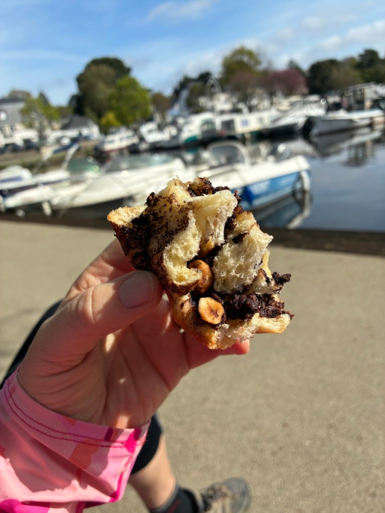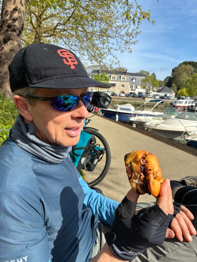 Leaving Nantes. The canal starts a bit outside of Nantes proper, and the leaving of cities is frequently a bit of a jumble.Pastry break! At 17 kms. That’s a chocolate babka from marguerite Boulangerie du coin in Nantes.